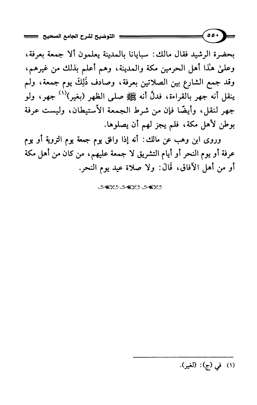 بحضرة الرشيد فقال مالك: سبايانا بالمدينة يعلمون ألا جمعة بعرفة، وعلى هذا أهل الحرمين مكة والمدينة، وهم أعلم بذلك من غيرهم، وقد جمع الشارع بين الصلاتين بعرفة، وصادف ذَلِكَ يوم جمعة، ولم ينقل أنه جهر بالقراءة، فدلَّ أنه - صلى الله عليه وسلم - صلى الظهر (بغير) (¬1) جهر، ولو جهر لنقل، وأيضًا فإن من شرط الجمعة الاستيطان، وليست عرفة بوطن لأهل مكة، فلم يجز لهم أن يصلوها.