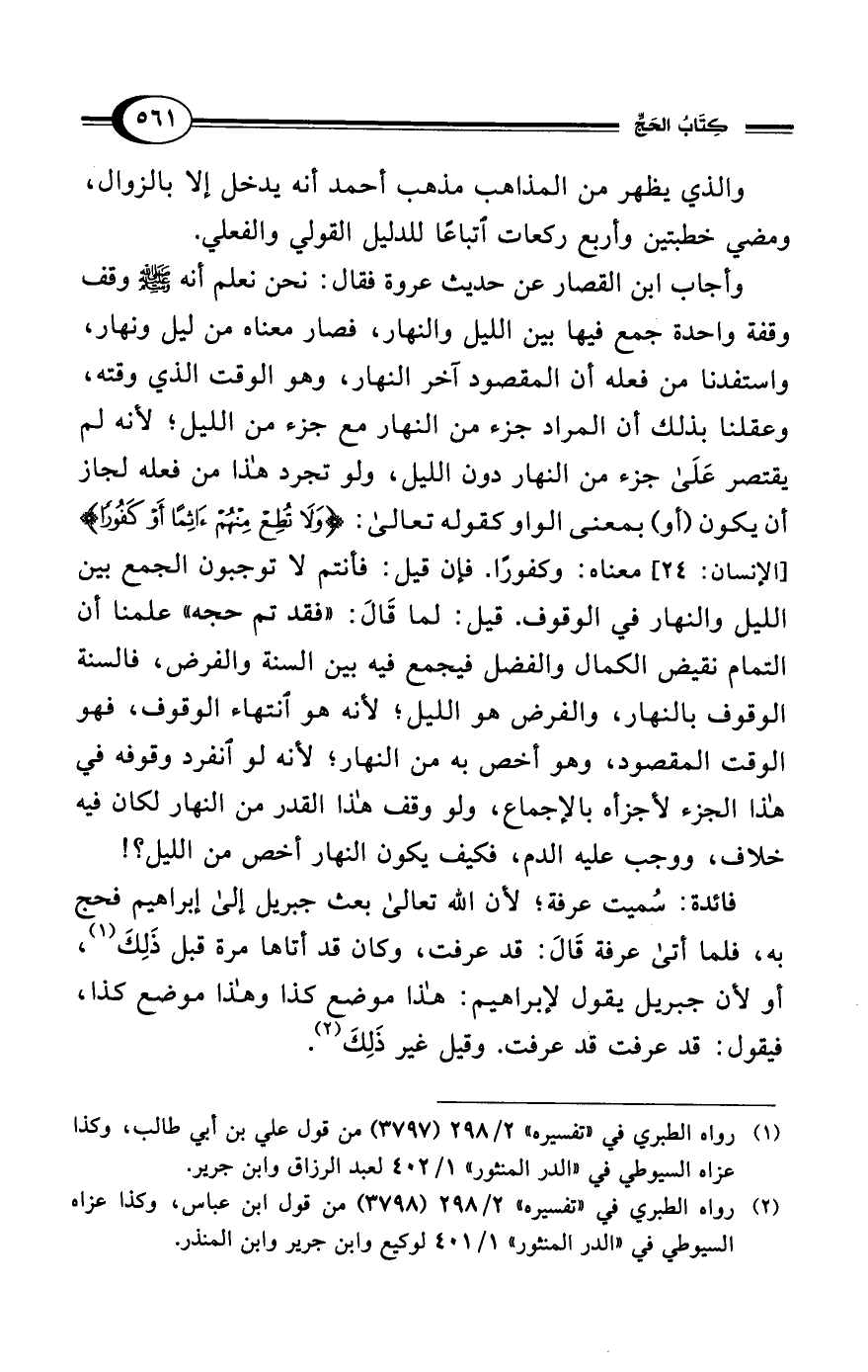 وأجاب ابن القصار عن حديث عروة فقال: نحن نعلم أنه - صلى الله عليه وسلم - وقف وقفة واحدة جمع فيها بين الليل والنهار، فصار معناه من ليل ونهار، واستفدنا من فعله أن المقصود آخر النهار، وهو الوقت الذي وقته، وعقلنا بذلك أن المراد جزء من النهار مع جزء من الليل؛ لأنه لم يقتصر عَلَى جزء من النهار دون الليل، ولو تجرد هذا من فعله لجاز أن يكون (أو) بمعنى الواو كقوله تعالى: {وَلَا تُطِعْ مِنْهُمْ آثِمًا أَوْ كَفُورًا} [الإنسان: 24] معناه: وكفورًا. فإن قيل: فأنتم لا توجبون الجمع بين الليل والنهار في الوقوف. قيل: لما قَالَ: "فقد تم حجه" علمنا أن التمام نقيض الكمال والفضل فيجمع فيه بين السنة والفرض، فالسنة الوقوف بالنهار، والفرض هو الليل؛ لأنه هو انتهاء الوقوف، فهو الوقت المقصود، وهو أخص به من النهار؛ لأنه لو انفرد وقوفه في هذا الجزء لأجزأه بالإجماع، ولو وقف هذا القدر من النهار لكان فيه خلاف، ووجب عليه الدم، فكيف يكون النهار أخص من الليل؟!
