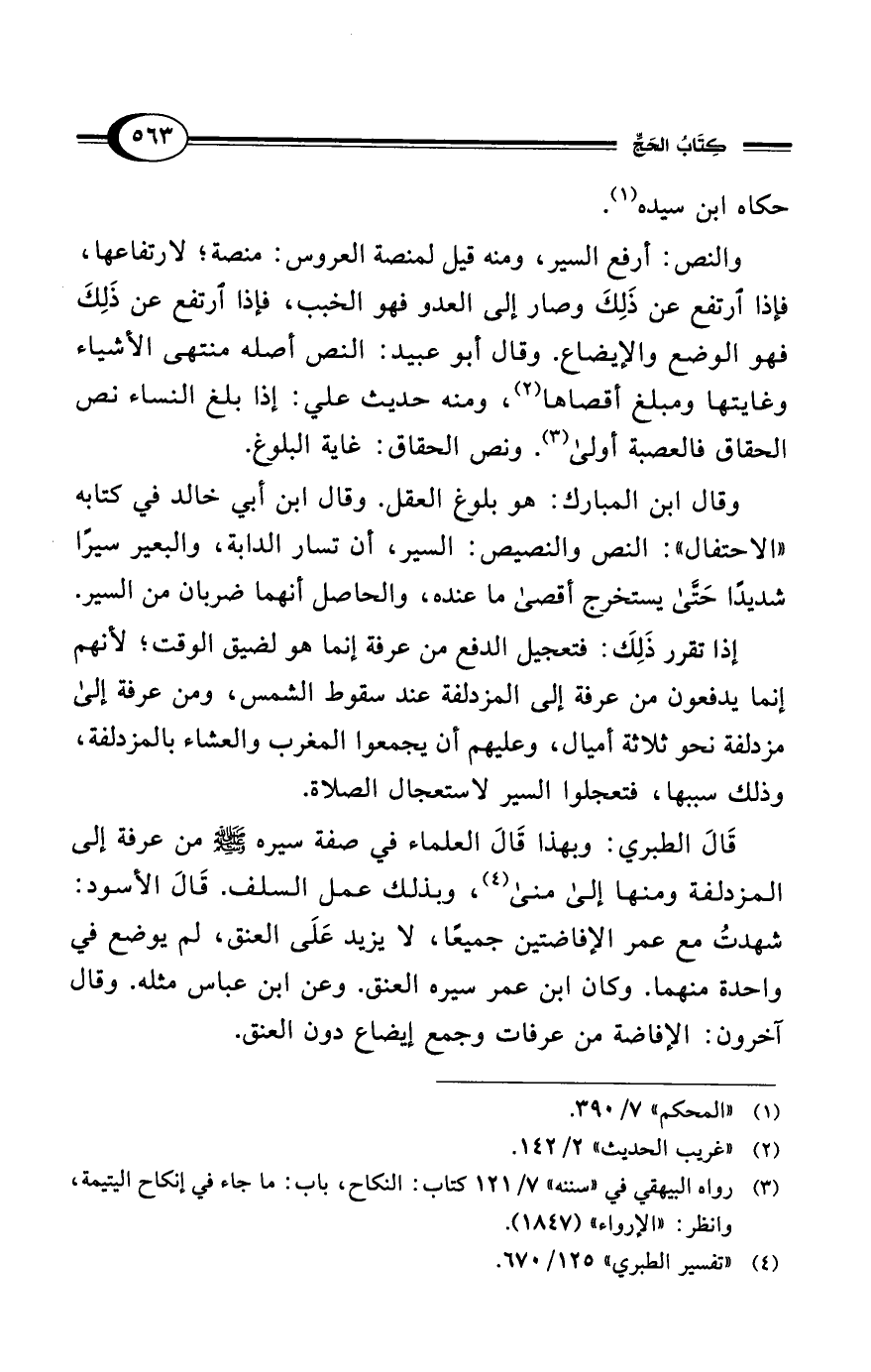 قَالَ الطبري: وبهذا قَالَ العلماء في صفة سيره - صلى الله عليه وسلم - من عرفة إلى المزدلفة ومنها إلى منى (¬4)، وبذلك عمل السلف. قَالَ الأسود: شهدتُ مع عمر الإفاضتين جميعًا، لا يزيد عَلَى العنق، لم يوضع في واحدة منهما. وكان ابن عمر سيره العنق. وعن ابن عباس مثله. وقال آخرون: الإفاضة من عرفات وجمع إيضاع دون العنق.