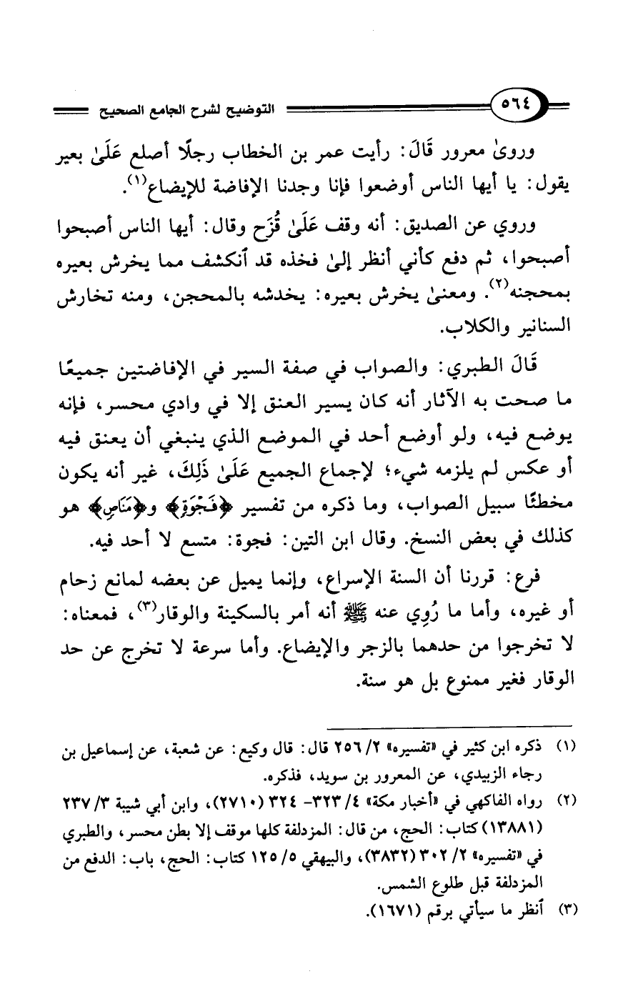 قَالَ الطبري: والصواب في صفة السير في الإفاضتين جميعًا ما صحت به الآثار أنه كان يسير العنق إلا في وادي محسر، فإنه يوضع فيه، ولو أوضع أحد في الموضع الذي ينبغي أن يعنق فيه أو عكس لم يلزمه شيء؛ لإجماع الجميع عَلَى ذَلِكَ، غير أنه يكون مخطئًا سبيل الصواب، وما ذكره من تفسير {فَجَوةٍ} و {مَنَاصٍ} هو كذلك في بعض النسخ. وقال ابن التين: فجوة: متسع لا أحد فيه.