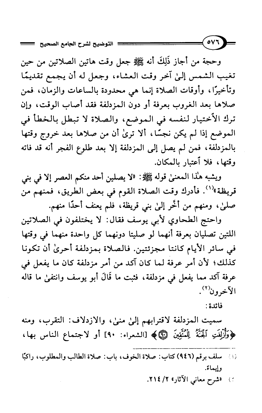 واحتج الطحاوي لأبي يوسف فقال: لا يختلفون في الصلاتين اللتين تصليان بعرفة أنهما لو صليتا دونهما كل واحدة منهما في وقتها في سائر الأيام كانتا مجزئتين. فالصلاة بمزدلفة أحرى أن تكونا كذلك؛ لأن أمر عرفة لما كان آكد من أمر مزدلفة كان ما يفعل في عرفة آكد مما يفعل في مزدلفة، فثبت ما قَالَ أبو يوسف وانتفي ما قاله الآخرون (¬2).