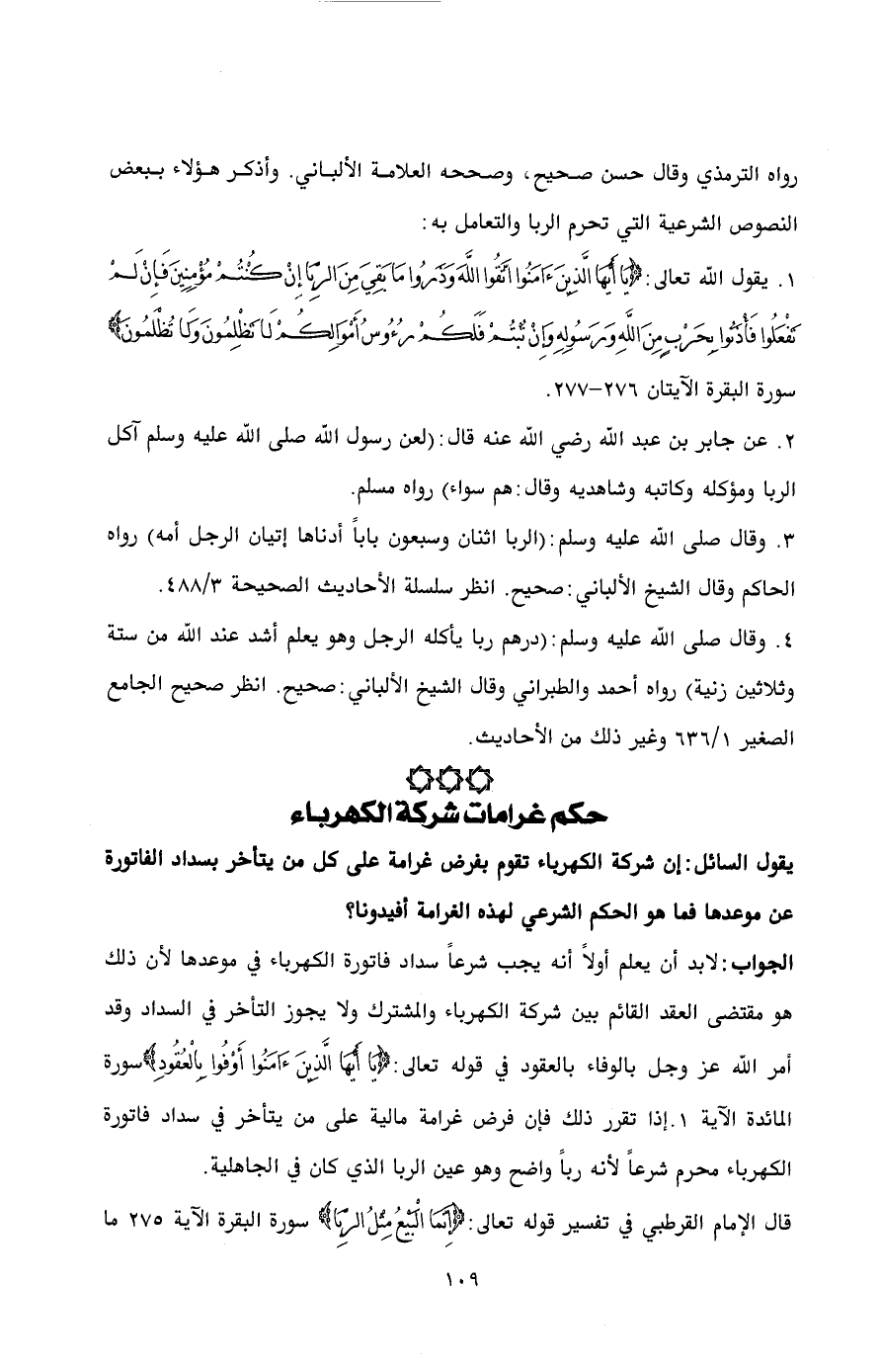 1. يقول الله تعالى: (يَا أَيُّهَا الَّذِينَءَامَنُوا اتَّقُوا اللَّهَ وَذَرُوا مَا بَقِيَ مِنَ الرِّبَا إِنْ كُنْتُمْ مُؤْمِنِينَ فَإِنْ لَمْ تَفْعَلُوا فَأْذَنُوا بِحَرْبٍ مِنَ اللَّهِ وَرَسُولِهِ وَإِنْ تُبْتُمْ فَلَكُمْ رُءُوسُ أَمْوَالِكُمْ لَا تَظْلِمُونَ وَلَا تُظْلَمُونَ) سورة البقرة الآيتان 276 - 277.