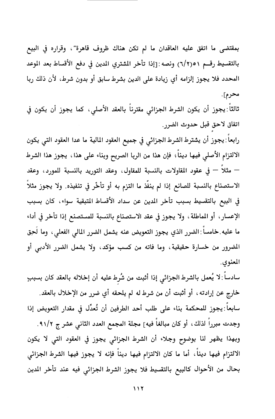 بمقتضى ما اتفق عليه العاقدان ما لم تكن هناك ظروف قاهرة"، وقراره في البيع بالتقسيط رقم 51 (2/ 6) ونصه: "إذا تأخر المشتري المدين في دفع الأقساط بعد الموعد المحدد فلا يجوز إلزامه أي زيادة على الدين بشرط سابق أو بدون شرط، لأن ذلك ربا محرم".