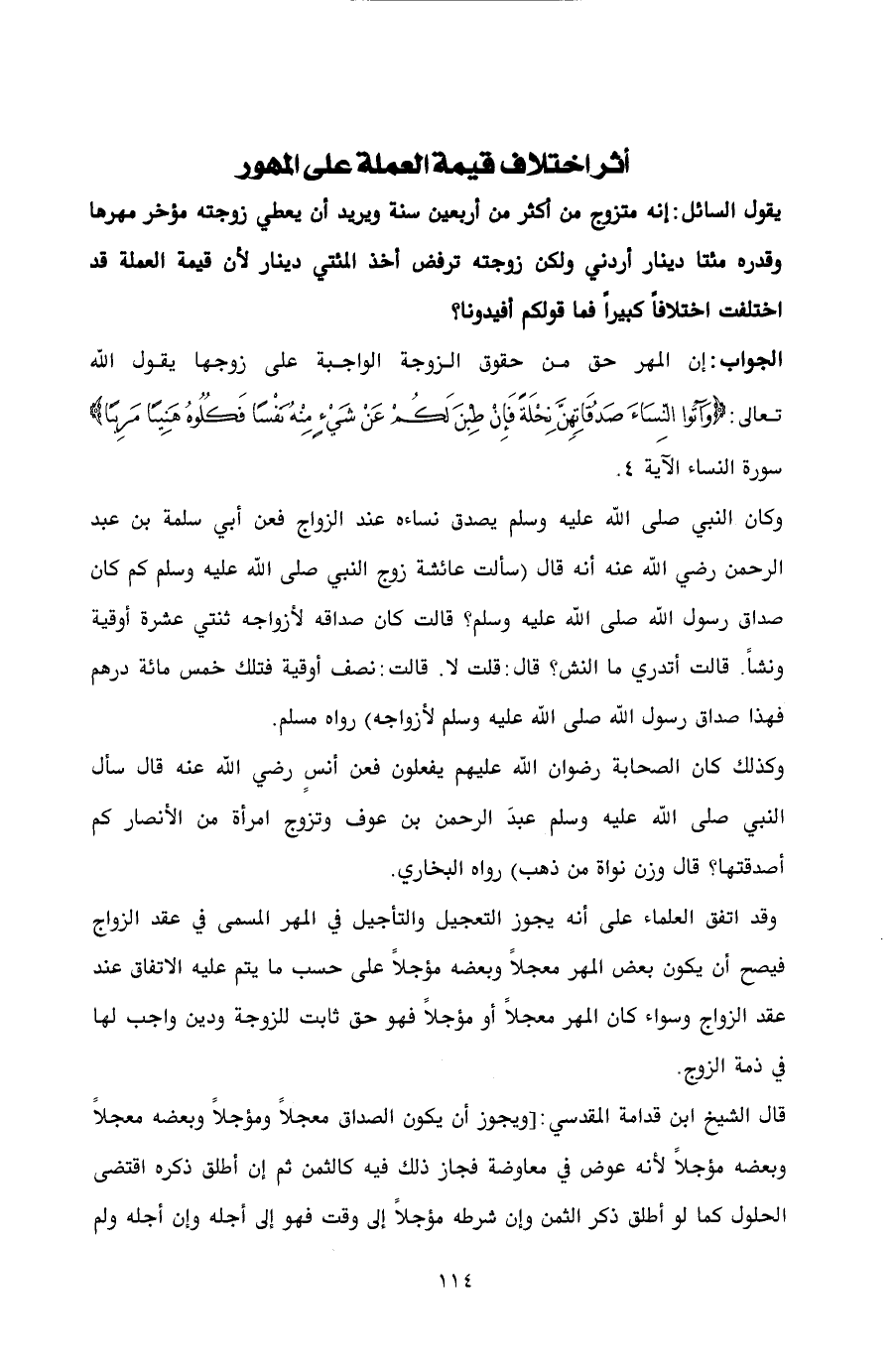 يقول السائل: إنه متزوج من أكثر من أربعين سنة ويريد أن يعطي زوجته مؤخر مهرها وقدره مئتا دينار أردني ولكن زوجته ترفض أخذ المئتي دينار لأن قيمة العملة قد اختلفت اختلافاً كبيراً فما قولكم أفيدونا؟
