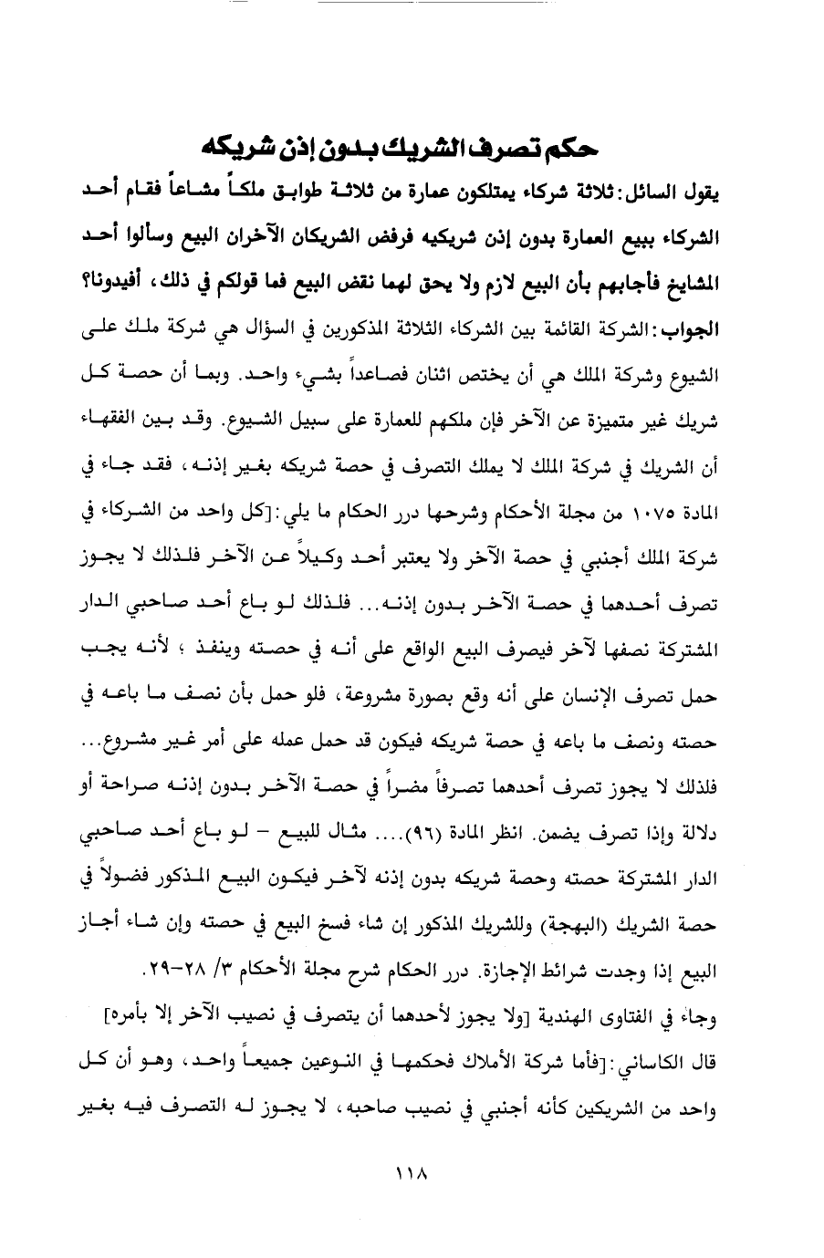الجواب: الشركة القائمة بين الشركاء الثلاثة المذكورين في السؤال هي شركة ملك على الشيوع وشركة الملك هي أن يختص اثنان فصاعداً بشيء واحد. وبما أن حصة كل شريك غير متميزة عن الآخر فإن ملكهم للعمارة على سبيل الشيوع. وقد بين الفقهاء أن الشريك في شركة الملك لا يملك التصرف في حصة شريكه بغير إذنه، فقد جاء في المادة 1075 من مجلة الأحكام وشرحها درر الحكام ما يلي: [كل واحد من الشركاء في شركة الملك أجنبي في حصة الآخر ولا يعتبر أحد وكيلاً عن الآخر فلذلك لا يجوز تصرف أحدهما في حصة الآخر بدون إذنه ... فلذلك لو باع أحد صاحبي الدار المشتركة نصفها لآخر فيصرف البيع الواقع على أنه في حصته وينفذ ; لأنه يجب حمل تصرف الإنسان على أنه وقع بصورة مشروعة، فلو حمل بأن نصف ما باعه في حصته ونصف ما باعه في حصة شريكه فيكون قد حمل عمله على أمر غير مشروع ... فلذلك لا يجوز تصرف أحدهما تصرفاً مضراً في حصة الآخر بدون إذنه صراحة أو دلالة وإذا تصرف يضمن. انظر المادة (96) .... مثال للبيع - لو باع أحد صاحبي الدار المشتركة حصته وحصة شريكه بدون إذنه لآخر فيكون البيع المذكور فضولاً في حصة الشريك (البهجة) وللشريك المذكور إن شاء فسخ البيع في حصته وإن شاء أجاز البيع إذا وجدت شرائط الإجازة. درر الحكام شرح مجلة الأحكام 3/ 28 - 29.