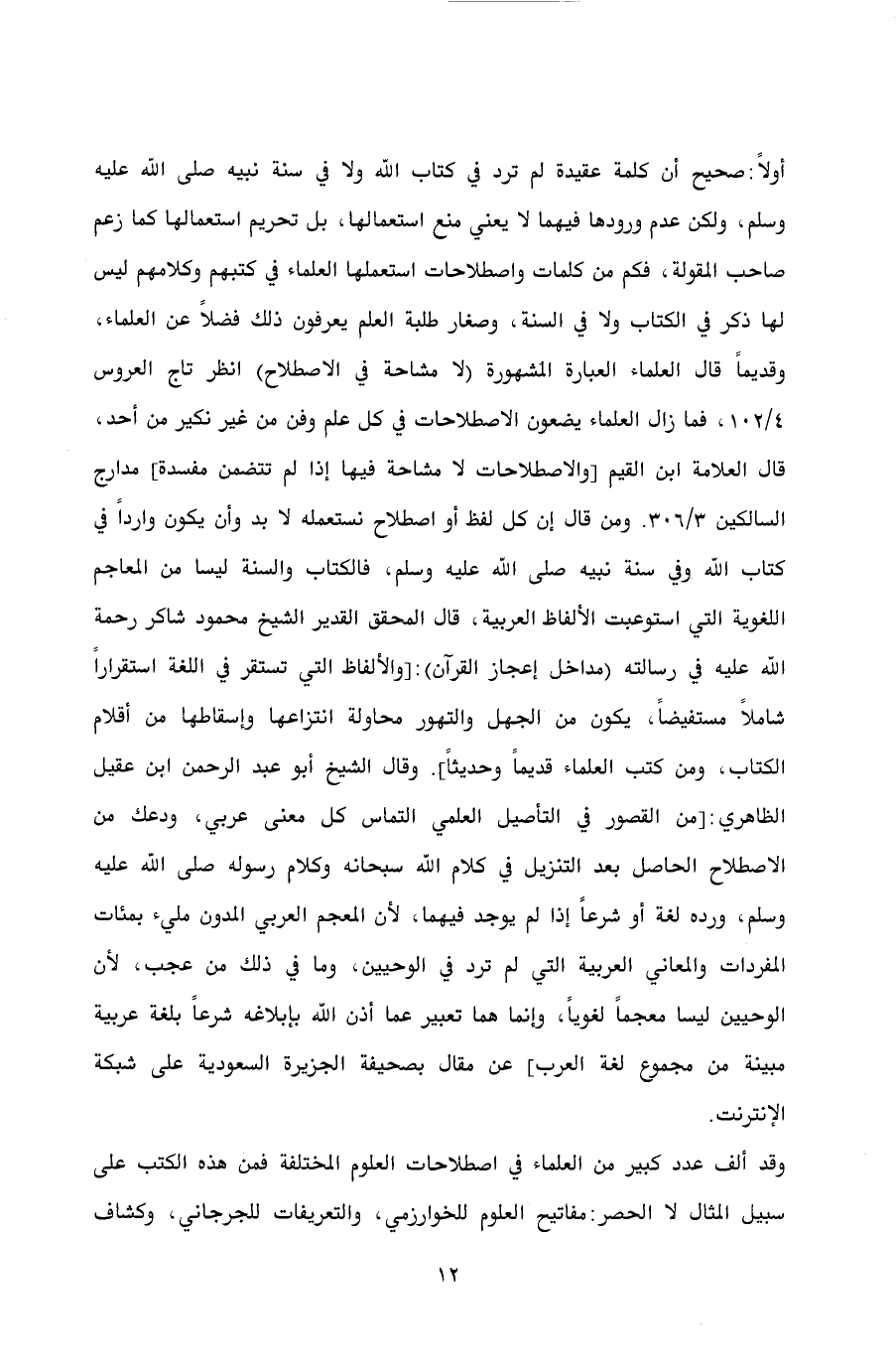 أولاً: صحيح أن كلمة عقيدة لم ترد في كتاب الله ولا في سنة نبيه صلى الله عليه وسلم، ولكن عدم ورودها فيهما لا يعني منع استعمالها، بل تحريم استعمالها كما زعم صاحب المقولة، فكم من كلمات واصطلاحات استعملها العلماء في كتبهم وكلامهم ليس لها ذكر في الكتاب ولا في السنة، وصغار طلبة العلم يعرفون ذلك فضلاً عن العلماء، وقديماً قال العلماء العبارة المشهورة (لا مشاحة في الاصطلاح) انظر تاج العروس 4/ 102، فما زال العلماء يضعون الاصطلاحات في كل علم وفن من غير نكير من أحد، قال العلامة ابن القيم [والاصطلاحات لا مشاحة فيها إذا لم تتضمن مفسدة] مدارج السالكين 3/ 306. ومن قال إن كل لفظ أو اصطلاح نستعمله لا بد وأن يكون وارداً في كتاب الله وفي سنة نبيه صلى الله عليه وسلم، فالكتاب والسنة ليسا من المعاجم اللغوية التي استوعبت الألفاظ العربية، قال المحقق القدير الشيخ محمود شاكر رحمة الله عليه في رسالته (مداخل إعجاز القرآن): [والألفاظ التي تستقر في اللغة استقراراً شاملاً مستفيضاً، يكون من الجهل والتهور محاولة انتزاعها وإسقاطها من أقلام الكتاب، ومن كتب العلماء قديماً وحديثاً]. وقال الشيخ أبو عبد الرحمن ابن عقيل الظاهري: [من القصور في التأصيل العلمي التماس كل معنى عربي، ودعك من الاصطلاح الحاصل بعد التنزيل في كلام الله سبحانه وكلام رسوله صلى الله عليه وسلم، ورده لغة أو شرعاً إذا لم يوجد فيهما، لأن المعجم العربي المدون مليء بمئات المفردات والمعاني العربية التي لم ترد في الوحيين، وما في ذلك من عجب، لأن الوحيين ليسا معجماً لغوياً، وإنما هما تعبير عما أذن الله بإبلاغه شرعاً بلغة عربية مبينة من مجموع لغة العرب] عن مقال بصحيفة الجزيرة السعودية على شبكة الإنترنت.