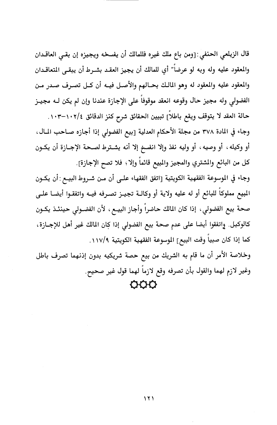 وخلاصة الأمر أن ما قام به الشريك من بيع حصة شريكيه بدون إذنهما تصرف باطل وغير لازم لهما والقول بأن تصرفه وقع لازماً لهما قول غير صحيح.