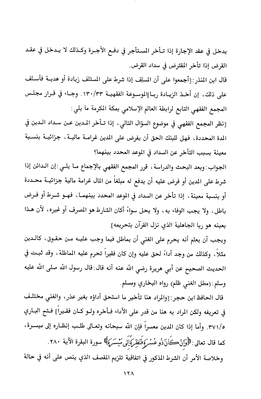 الجواب: وبعد البحث والدراسة، قرر المجمع الفقهي بالإجماع ما يلي: إن الدائن إذا شرط على المدين أو فرض عليه أن يدفع له مبلغاً من المال غرامة مالية جزائية محددة أو بنسبة معينة، إذا تأخر عن السداد في الموعد المحدد بينهما، فهو شرط أو فرض باطل، ولا يجب الوفاء به، ولا يحل سواءً أكان الشارط هو المصرف أو غيره، لأن هذا بعينه هو ربا الجاهلية الذي نزل القرآن بتحريمه.]