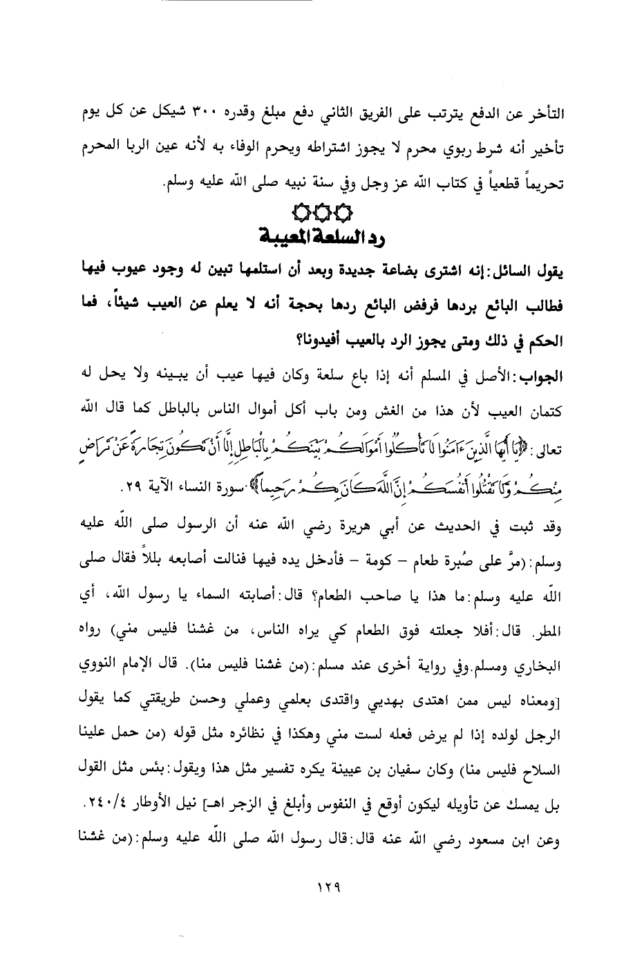 يقول السائل: إنه اشترى بضاعة جديدة وبعد أن استلمها تبين له وجود عيوب فيها فطالب البائع بردها فرفض البائع ردها بحجة أنه لا يعلم عن العيب شيئاً، فما الحكم في ذلك ومتى يجوز الرد بالعيب أفيدونا؟