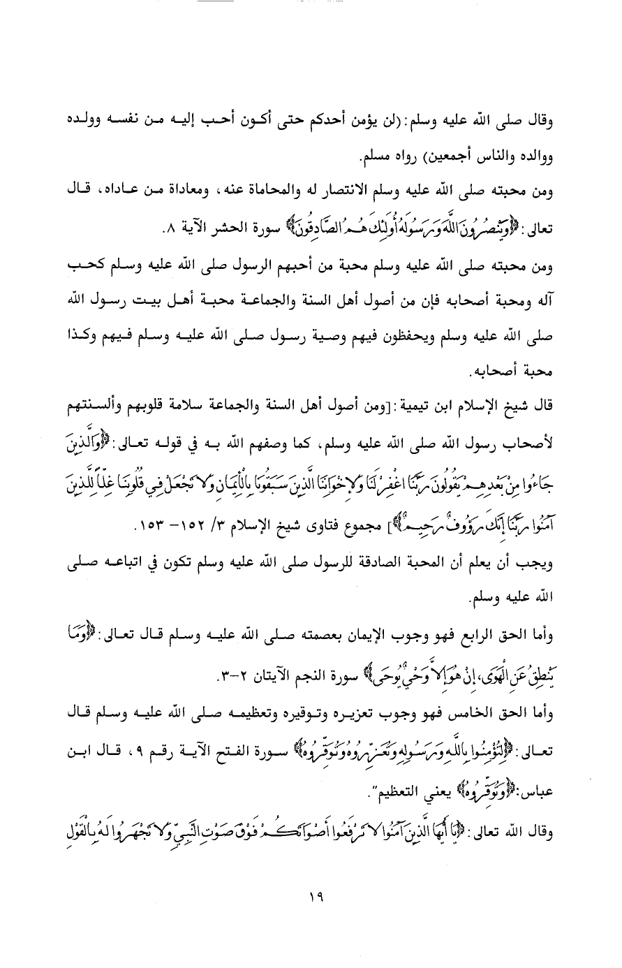 ومن محبته صلى الله عليه وسلم محبة من أحبهم الرسول صلى الله عليه وسلم كحب آله ومحبة أصحابه فإن من أصول أهل السنة والجماعة محبة أهل بيت رسول الله صلى الله عليه وسلم ويحفظون فيهم وصية رسول صلى الله عليه وسلم فيهم وكذا محبة أصحابه.