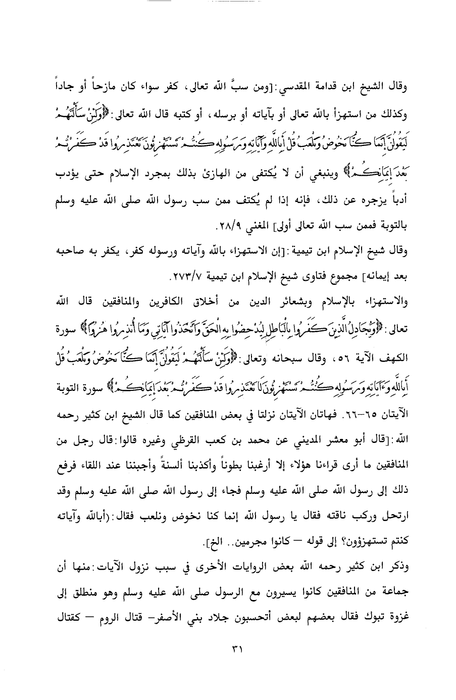 وقال شيخ الإسلام ابن تيمية: [إن الاستهزاء بالله وآياته ورسوله كفر، يكفر به صاحبه بعد إيمانه] مجموع فتاوى شيخ الإسلام ابن تيمية 7/ 273.