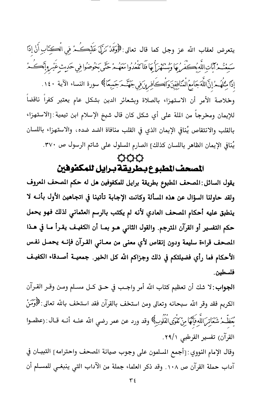 يقول السائل: المصحف المطبوع بطريقة برايل للمكفوفين هل له حكم المصحف المعروف ولقد حاولنا السؤال عن هذه المسألة وكانت الإجابة تأتينا في اتجاهين الأول بأنه لا ينطبق عليه أحكام المصحف العادي لأنه لم يكتب بالرسم العثماني لذلك فهو يحمل حكم التفسير أو القرآن المترجم. والقول الثاني هو بما أن الكفيف يقرأ ما في هذا المصحف قراءة سليمة ودون إنقاص لأي معنى من معاني القرآن فإنه يحمل نفس الأحكام فما رأي فضيلتكم في ذلك وجزاكم الله كل الخير. جمعية أصدقاء الكفيف فلسطين.