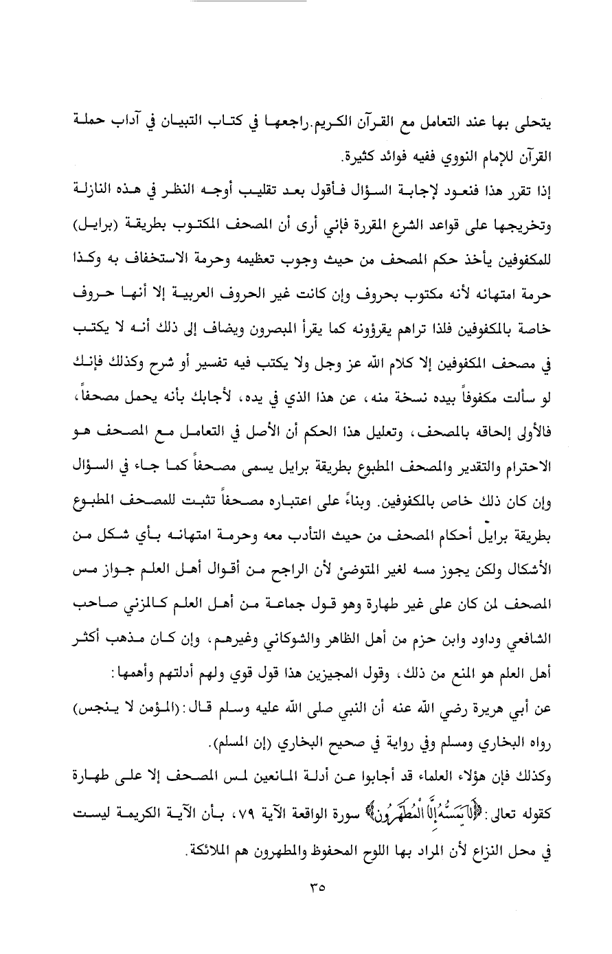 إذا تقرر هذا فنعود لإجابة السؤال فأقول بعد تقليب أوجه النظر في هذه النازلة وتخريجها على قواعد الشرع المقررة فإني أرى أن المصحف المكتوب بطريقة (برايل) للمكفوفين يأخذ حكم المصحف من حيث وجوب تعظيمه وحرمة الاستخفاف به وكذا حرمة امتهانه لأنه مكتوب بحروف وإن كانت غير الحروف العربية إلا أنها حروف خاصة بالمكفوفين فلذا تراهم يقرأونه كما يقرأ المبصرون ويضاف إلى ذلك أنه لا يكتب في مصحف المكفوفين إلا كلام الله عز وجل ولا يكتب فيه تفسير أو شرح وكذلك فإنك لو سألت مكفوفاً بيده نسخة منه، عن هذا الذي في يده، لأجابك بأنه يحمل مصحفاً، فالأولى إلحاقه بالمصحف، وتعليل هذا الحكم أن الأصل في التعامل مع المصحف هو الاحترام والتقدير والمصحف المطبوع بطريقة برايل يسمى مصحفاً كما جاء في السؤال وإن كان ذلك خاص بالمكفوفين. وبناءً على اعتباره مصحفاً تثبت للمصحف المطبوع بطريقة برايل أحكام المصحف من حيث التأدب معه وحرمة امتهانه بأي شكل من الأشكال ولكن يجوز مسه لغير المتوضئ لأن الراجح من أقوال أهل العلم جواز مس المصحف لمن كان على غير طهارة وهو قول جماعة من أهل العلم كالمزني صاحب الشافعي وداود وابن حزم من أهل الظاهر والشوكاني وغيرهم، وإن كان مذهب أكثر أهل العلم هو المنع من ذلك، وقول المجيزين هذا قول قوي ولهم أدلتهم وأهمها: