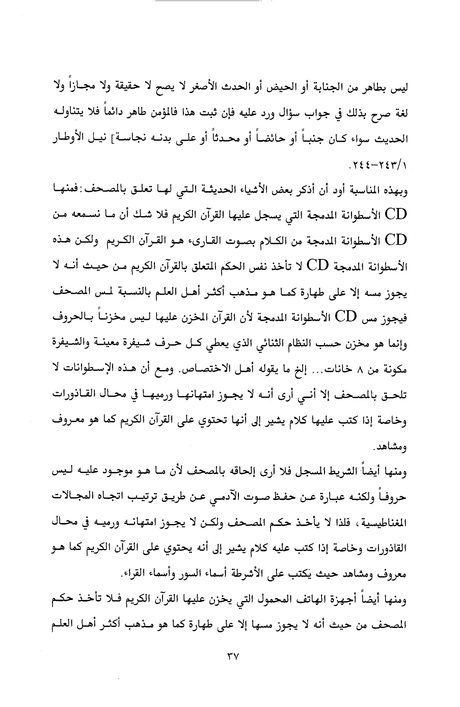 وبهذه المناسبة أود أن أذكر بعض الأشياء الحديثة التي لها تعلق بالمصحف: فمنها C D الأسطوانة المدمجة التي يسجل عليها القرآن الكريم فلا شك أن ما نسمعه من C D الأسطوانة المدمجة من الكلام بصوت القارىء هو القرآن الكريم ولكن هذه الأسطوانة المدمجة C D لا تأخذ نفس الحكم المتعلق بالقرآن الكريم من حيث أنه لا يجوز مسه إلا على طهارة كما هو مذهب أكثر أهل العلم بالنسبة لمس المصحف فيجوز مس C D الأسطوانة المدمجة لأن القرآن المخزن عليها ليس مخزناً بالحروف وإنما هو مخزن حسب النظام الثنائي الذي يعطي كل حرف شيفرة معينة والشيفرة مكونة من 8 خانات ... إلخ ما يقوله أهل الاختصاص. ومع أن هذه الإسطوانات لا تلحق بالمصحف إلا أني أرى أنه لا يجوز امتهانها ورميها في محال القاذورات وخاصة إذا كتب عليها كلام يشير إلى أنها تحتوي على القرآن الكريم كما هو معروف ومشاهد.