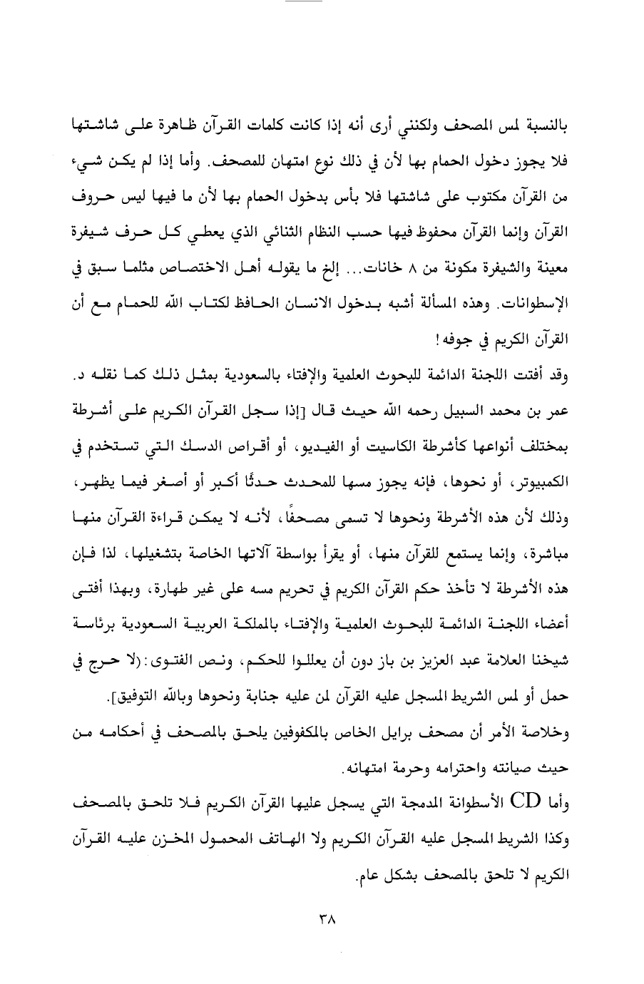 وأما C D الأسطوانة المدمجة التي يسجل عليها القرآن الكريم فلا تلحق بالمصحف وكذا الشريط المسجل عليه القرآن الكريم ولا الهاتف المحمول المخزن عليه القرآن الكريم لا تلحق بالمصحف بشكل عام.
