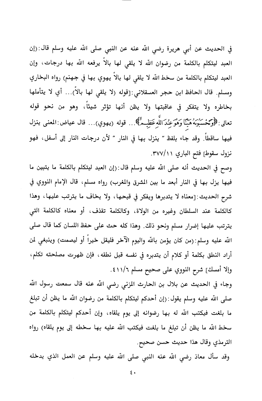 في الحديث عن أبي هريرة رضي الله عنه عن النبي صلى الله عليه وسلم قال: (إن العبد ليتكلم بالكلمة من رضوان الله لا يلقي لها بالاً يرفعه الله بها درجات، وإن العبد ليتكلم بالكلمة من سخط الله لا يلقي لها بالاً يهوي بها في جهنم) رواه البخاري ومسلم. قال الحافظ ابن حجر العسقلاني: [قوله (لا يلقي لها بالاً) ... أي لا يتأملها بخاطره ولا يتفكر في عاقبتها ولا يظن أنها تؤثر شيئاً، وهو من نحو قوله تعالى (وتحسبونه هيناً وهو عند الله عظيم) ... قوله (يهوى) ... قال عياض: المعنى ينزل فيها ساقطاً. وقد جاء بلفظ " ينزل بها في النار " لأن درجات النار إلى أسفل، فهو نزول سقوط] فتح الباري 11/ 377.
