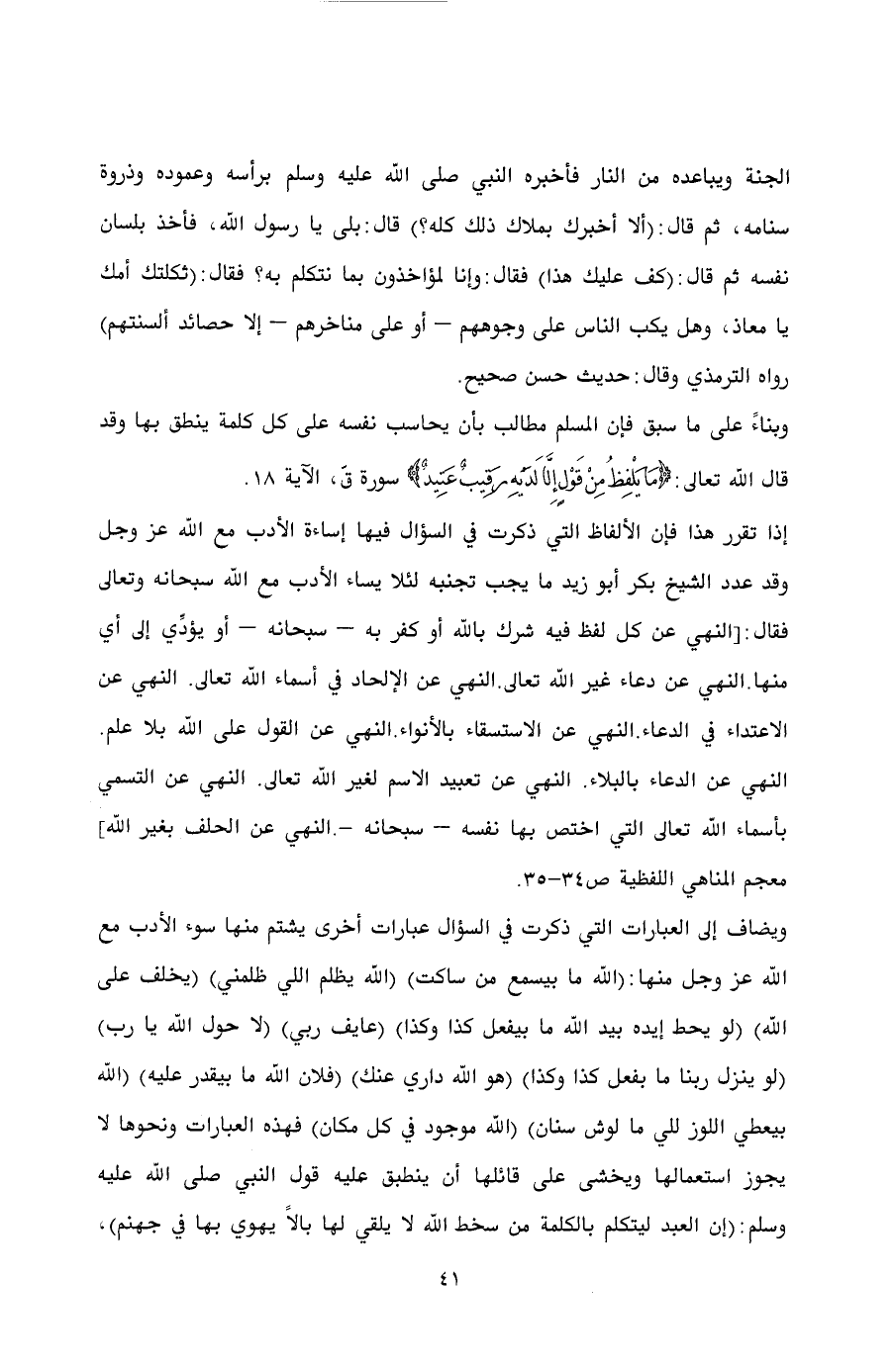 الجنة ويباعده من النار فأخبره النبي صلى الله عليه وسلم برأسه وعموده وذروة سنامه، ثم قال: (ألا أخبرك بملاك ذلك كله؟) قال: بلى يا رسول الله، فأخذ بلسان نفسه ثم قال: (كف عليك هذا) فقال: وإنا لمؤاخذون بما نتكلم به؟ فقال: (ثكلتك أمك يا معاذ، وهل يكب الناس على وجوههم - أو على مناخرهم - إلا حصائد ألسنتهم) رواه الترمذي وقال: حديث حسن صحيح.