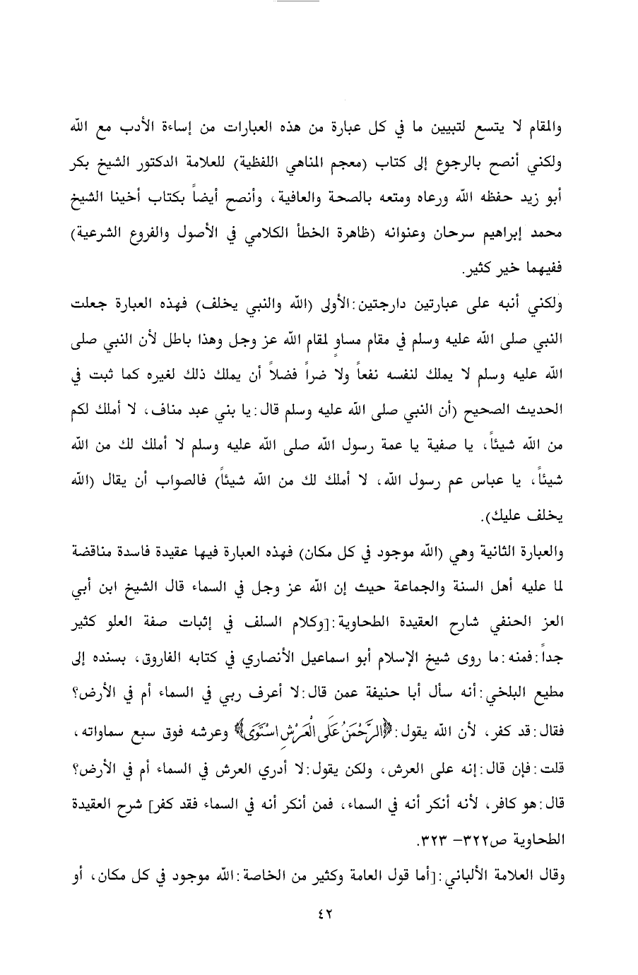 والمقام لا يتسع لتبيين ما في كل عبارة من هذه العبارات من إساءة الأدب مع الله ولكني أنصح بالرجوع إلى كتاب (معجم المناهي اللفظية) للعلامة الدكتور الشيخ بكر أبو زيد حفظه الله ورعاه ومتعه بالصحة والعافية، وأنصح أيضاً بكتاب أخينا الشيخ محمد إبراهيم سرحان وعنوانه (ظاهرة الخطأ الكلامي في الأصول والفروع الشرعية) ففيهما خير كثير.