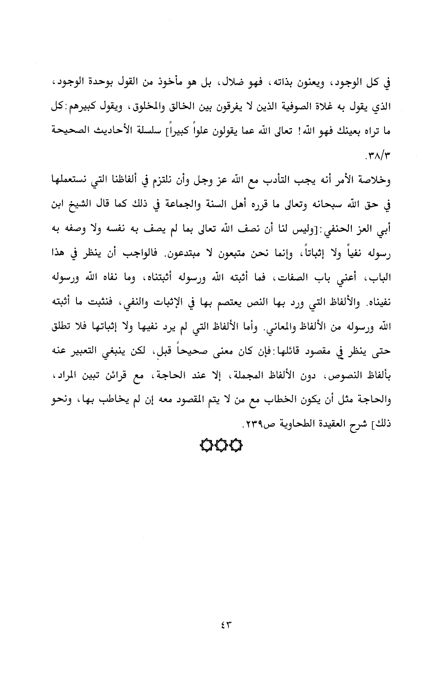 وخلاصة الأمر أنه يجب التأدب مع الله عز وجل وأن نلتزم في ألفاظنا التي نستعملها في حق الله سبحانه وتعالى ما قرره أهل السنة والجماعة في ذلك كما قال الشيخ ابن أبي العز الحنفي: [وليس لنا أن نصف الله تعالى بما لم يصف به نفسه ولا وصفه به رسوله نفياً ولا إثباتاً، وإنما نحن متبعون لا مبتدعون. فالواجب أن ينظر في هذا الباب، أعني باب الصفات، فما أثبته الله ورسوله أثبتناه، وما نفاه الله ورسوله نفيناه. والألفاظ التي ورد بها النص يعتصم بها في الإثبات والنفي، فنثبت ما أثبته الله ورسوله من الألفاظ والمعاني. وأما الألفاظ التي لم يرد نفيها ولا إثباتها فلا تطلق حتى ينظر في مقصود قائلها: فإن كان معنى صحيحاً قبل، لكن ينبغي التعبير عنه بألفاظ النصوص، دون الألفاظ المجملة، إلا عند الحاجة، مع قرائن تبين المراد، والحاجة مثل أن يكون الخطاب مع من لا يتم المقصود معه إن لم يخاطب بها، ونحو ذلك] شرح العقيدة الطحاوية ص239.