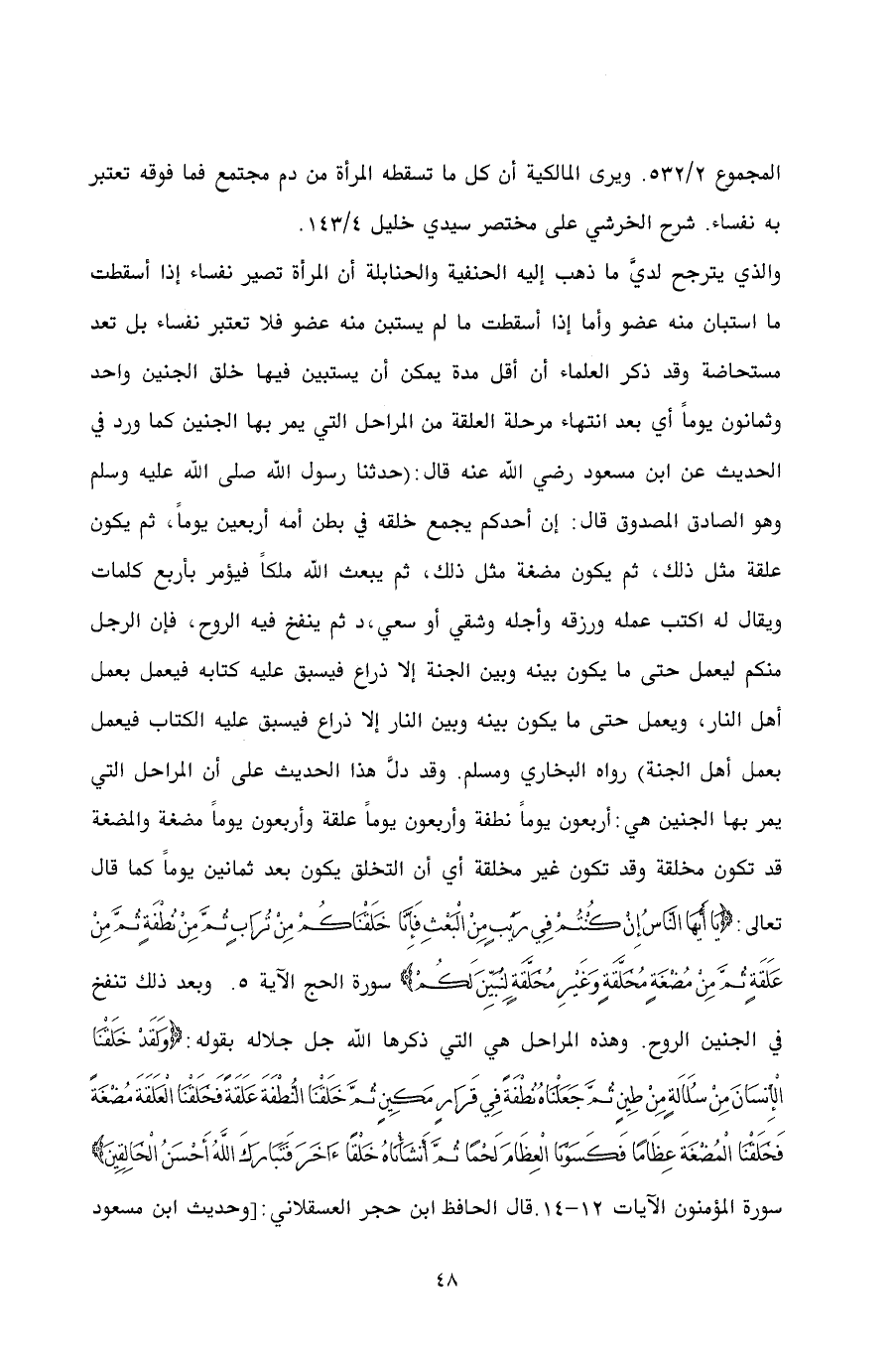 وهذه المراحل هي التي ذكرها الله جل جلاله بقوله {وَلَقَدْ خَلَقْنَا الْإِنْسَانَ مِنْ سُلَالَةٍ مِنْ طِينٍ ثُمَّ جَعَلْنَاهُ نُطْفَةً فِي قَرَارٍ مَكِينٍ ثُمَّ خَلَقْنَا النُّطْفَةَ عَلَقَةً فَخَلَقْنَا الْعَلَقَةَ مُضْغَةً فَخَلَقْنَا الْمُضْغَةَ عِظَامًا فَكَسَوْنَا الْعِظَامَ لَحْمًا ثُمَّ أَنْشَأْنَاهُ خَلْقًاءَاخَرَ فَتَبَارَكَ اللَّهُ أَحْسَنُ الْخَالِقِينَ} سورة المؤمنون الآيات 12 - 14. قال الحافظ ابن حجر العسقلاني: [وحديث ابن مسعود
