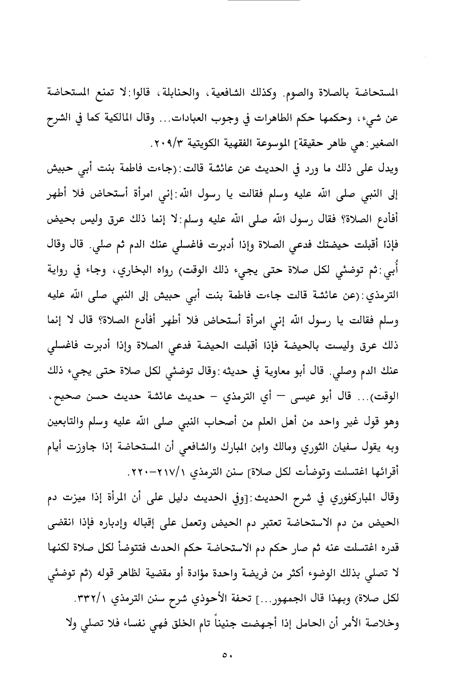 المستحاضة بالصلاة والصوم. وكذلك الشافعية، والحنابلة، قالوا: لا تمنع المستحاضة عن شيء، وحكمها حكم الطاهرات في وجوب العبادات ... وقال المالكية كما في الشرح الصغير: هي طاهر حقيقة.] الموسوعة الفقهية الكويتية 3/ 209.