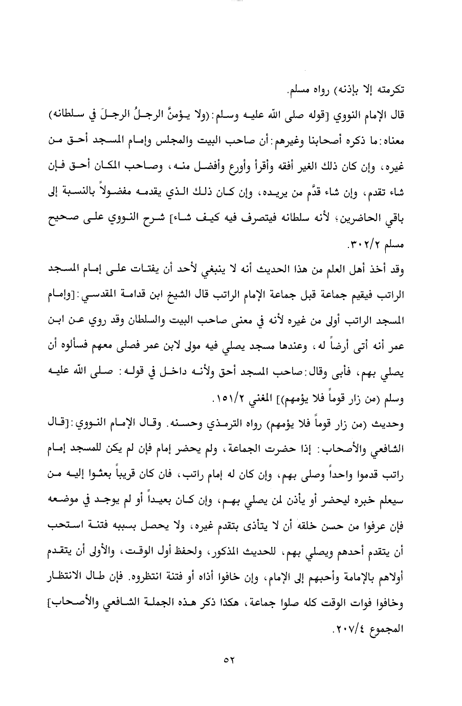 وقد أخذ أهل العلم من هذا الحديث أنه لا ينبغي لأحد أن يفتات على إمام المسجد الراتب فيقيم جماعة قبل جماعة الإمام الراتب قال الشيخ ابن قدامة المقدسي [وإمام المسجد الراتب أولى من غيره لأنه في معنى صاحب البيت والسلطان وقد روي عن ابن عمر أنه أتى أرضاً له، وعندها مسجد يصلي فيه مولى لابن عمر فصلى معهم فسألوه أن يصلي بهم، فأبى وقال: صاحب المسجد أحق ولأنه داخل في قوله: صلى الله عليه وسلم (من زار قوماً فلا يؤمهم)] المغني 2/ 151.