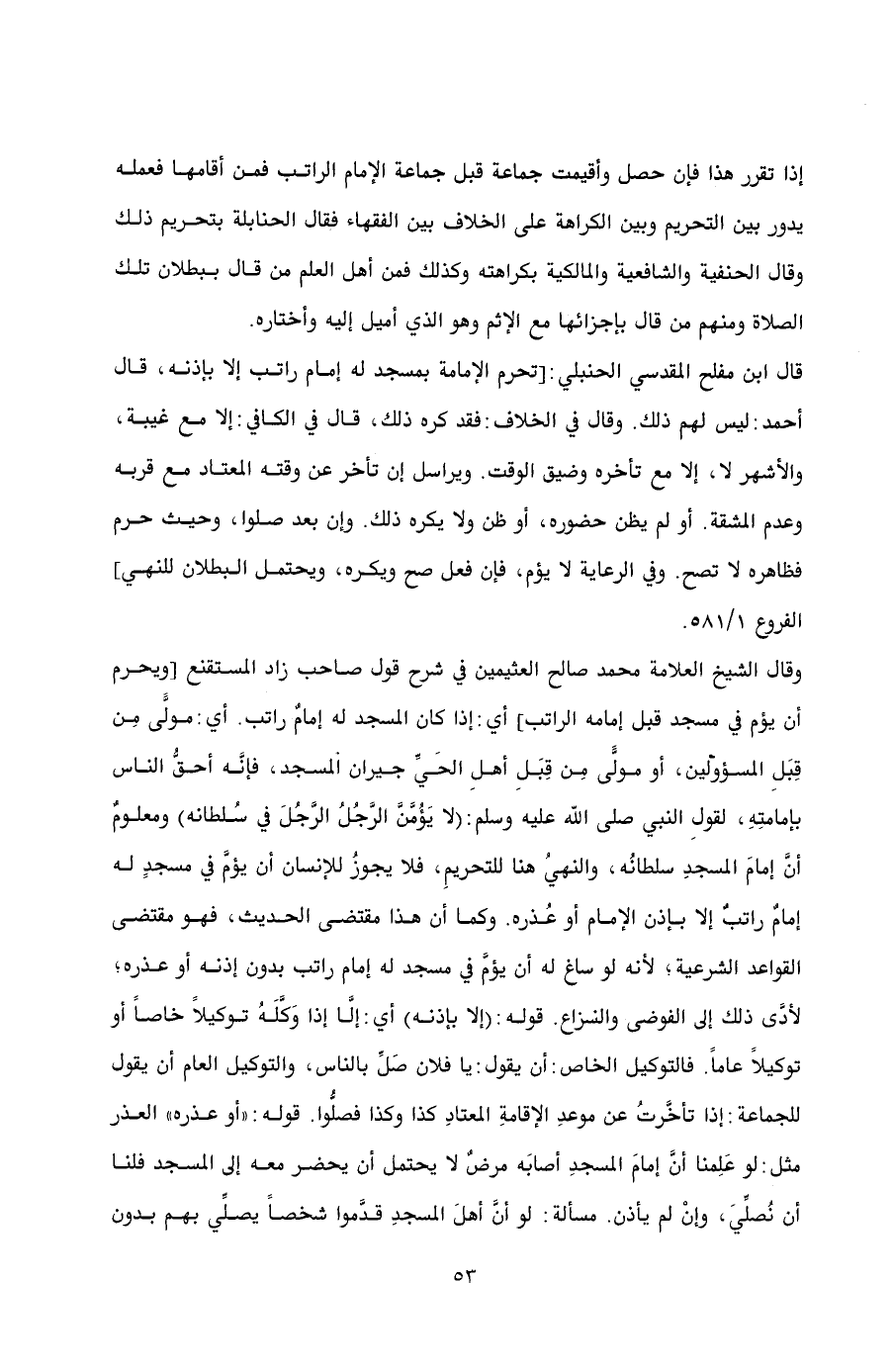 وقال الشيخ العلامة محمد صالح العثيمين في شرح قول صاحب زاد المستقنع [ويحرم أن يؤم في مسجد قبل إمامه الراتب] أي: إذا كان المسجد له إمامٌ راتب. أي: مولًّى مِن قِبَلِ المسؤولين، أو مولًّى مِن قِبَلِ أهلِ الحَيِّ جيران المسجد، فإنَّه أحقُّ الناس بإمامتِهِ، لقولِ النبي صلى الله عليه وسلم: (لا يَؤُمَّنَّ الرَّجُلُ الرَّجُلَ في سُلطانه) ومعلومٌ أنَّ إمامَ المسجدِ سلطانُه، والنهيُ هنا للتحريمِ، فلا يجوزُ للإنسان أن يؤمَّ في مسجدٍ له إمامٌ راتبٌ إلا بإذن الإمام أو عُذره. وكما أن هذا مقتضى الحديث، فهو مقتضى القواعد الشرعية؛ لأنه لو ساغ له أن يؤمَّ في مسجد له إمام راتب بدون إذنه أو عذره؛ لأدَّى ذلك إلى الفوضى والنزاع. قوله: (إلا بإذنه) أي: إلَّا إذا وَكَّلَهُ توكيلاً خاصاً أو توكيلاً عاماً. فالتوكيل الخاص: أن يقول: يا فلان صَلِّ بالناس، والتوكيل العام أن يقول للجماعة: إذا تأخَّرتُ عن موعدِ الإقامةِ المعتادِ كذا وكذا فصلُّوا. قوله: «أو عذره» العذر مثل: لو عَلِمنا أنَّ إمامَ المسجدِ أصابَه مرضٌ لا يحتمل أن يحضر معه إلى المسجد فلنا أن نُصلِّيَ، وإنْ لم يأذن. مسألة: لو أنَّ أهلَ المسجدِ قدَّموا شخصاً يصلِّي بهم بدون