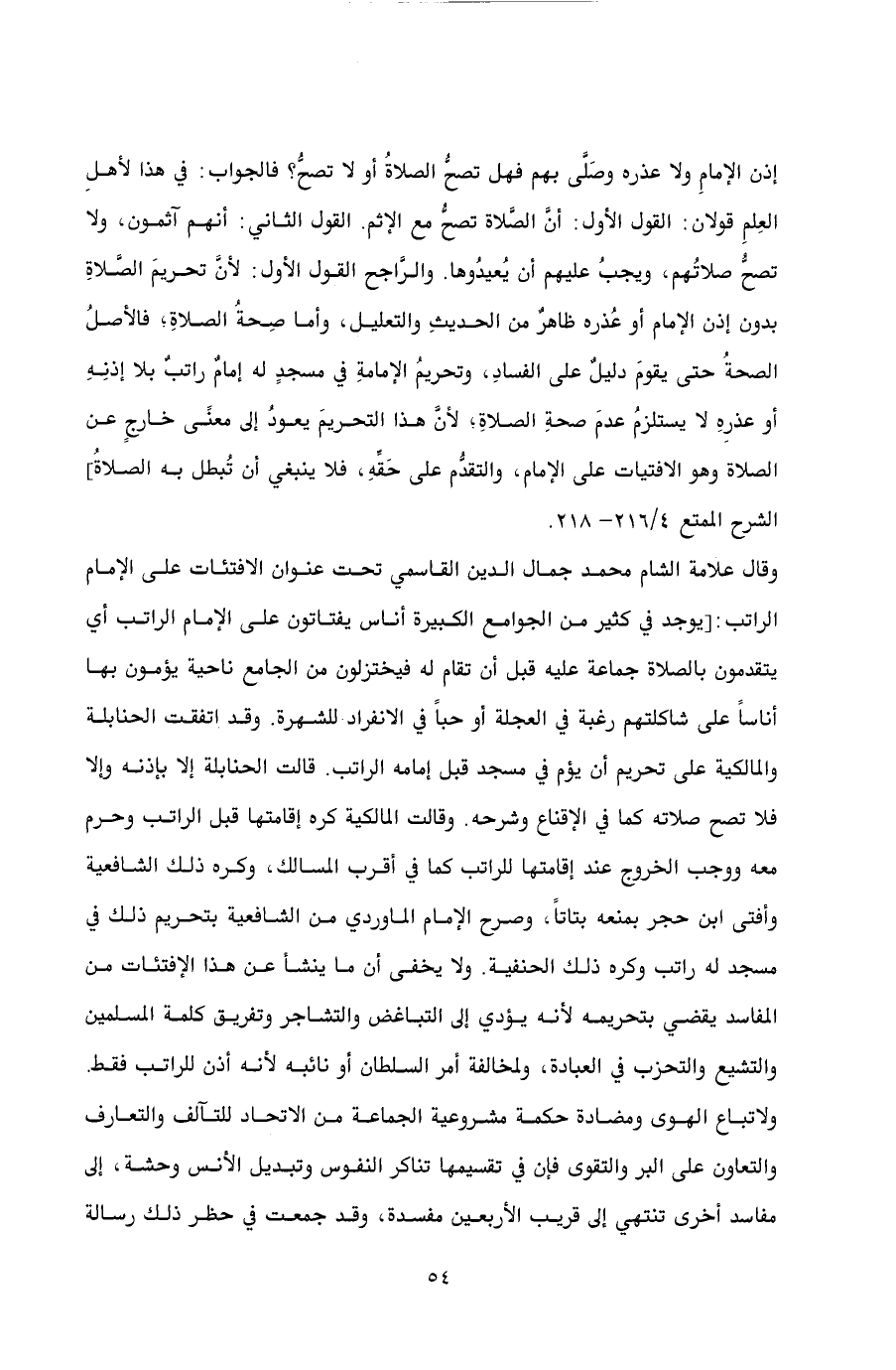 وقال علامة الشام محمد جمال الدين القاسمي تحت عنوان الافتئات على الإمام الراتب: [يوجد في كثير من الجوامع الكبيرة أناس يفتاتون على الإمام الراتب أي يتقدمون بالصلاة جماعة عليه قبل أن تقام له فيختزلون من الجامع ناحية يؤمون بها أناساً على شاكلتهم رغبة في العجلة أو حباً في الانفراد للشهرة. وقد اتفقت الحنابلة والمالكية على تحريم أن يؤم في مسجد قبل إمامه الراتب. قالت الحنابلة إلا بإذنه وإلا فلا تصح صلاته كما في الإقناع وشرحه. وقالت المالكية كره إقامتها قبل الراتب وحرم معه ووجب الخروج عند إقامتها للراتب كما في أقرب المسالك، وكره ذلك الشافعية وأفتى ابن حجر بمنعه بتاتاً، وصرح الإمام الماوردي من الشافعية بتحريم ذلك في مسجد له راتب وكره ذلك الحنفية. ولا يخفى أن ما ينشأ عن هذا الإفتئات من المفاسد يقضي بتحريمه لأنه يؤدي إلى التباغض والتشاجر وتفريق كلمة المسلمين والتشيع والتحزب في العبادة، ولمخالفة أمر السلطان أو نائبه لأنه أذن للراتب فقط. ولاتباع الهوى ومضادة حكمة مشروعية الجماعة من الاتحاد للتآلف والتعارف والتعاون على البر والتقوى فإن في تقسيمها تناكر النفوس وتبديل الأنس وحشة، إلى مفاسد أخرى تنتهي إلى قريب الأربعين مفسدة، وقد جمعت في حظر ذلك رسالة