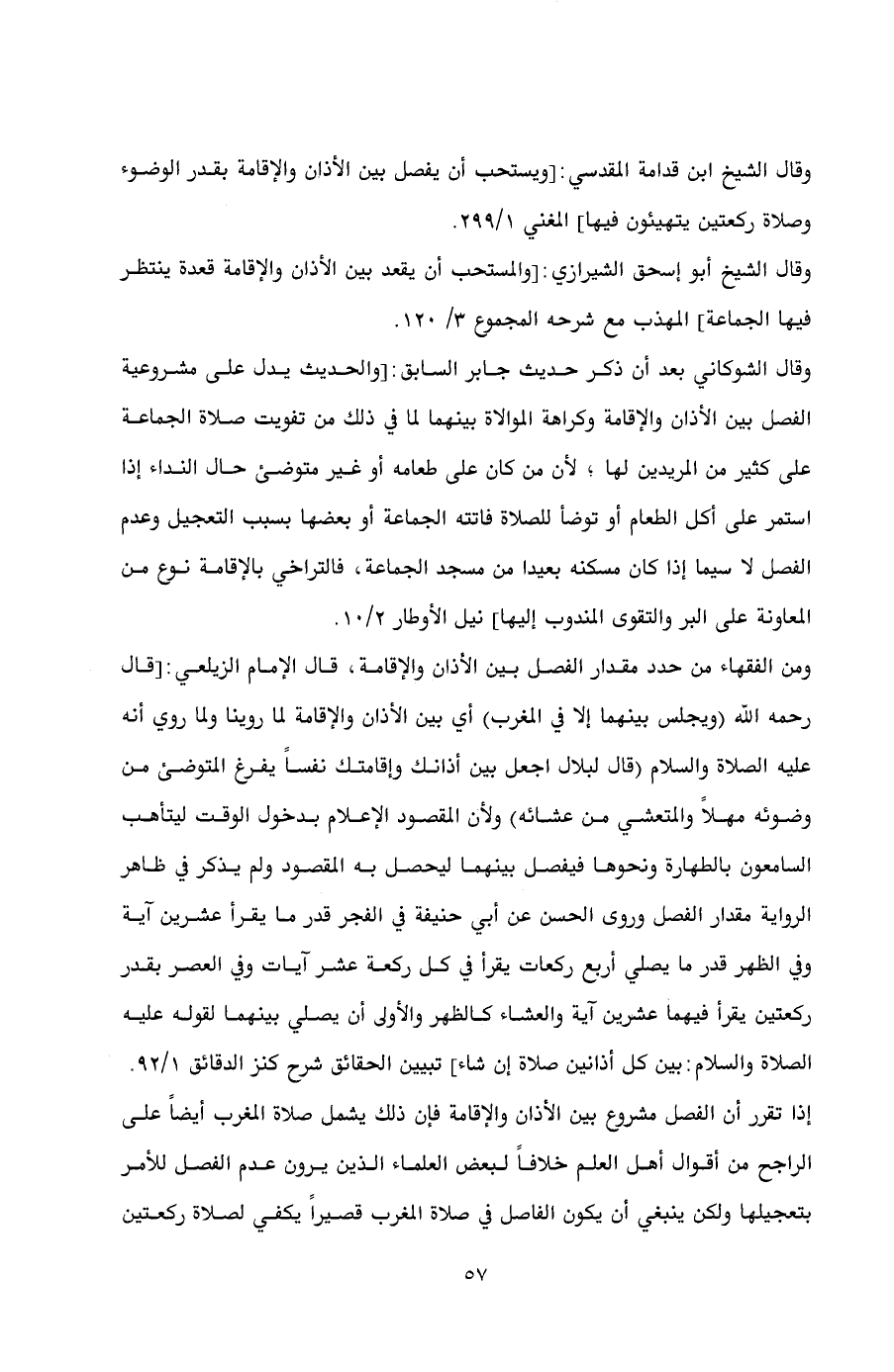 وقال الشوكاني بعد أن ذكر حديث جابر السابق [والحديث يدل على مشروعية الفصل بين الأذان والإقامة وكراهة الموالاة بينهما لما في ذلك من تفويت صلاة الجماعة على كثير من المريدين لها ; لأن من كان على طعامه أو غير متوضئ حال النداء إذا استمر على أكل الطعام أو توضأ للصلاة فاتته الجماعة أو بعضها بسبب التعجيل وعدم الفصل لا سيما إذا كان مسكنه بعيدا من مسجد الجماعة، فالتراخي بالإقامة نوع من المعاونة على البر والتقوى المندوب إليها.] نيل الأوطار 2/ 10.