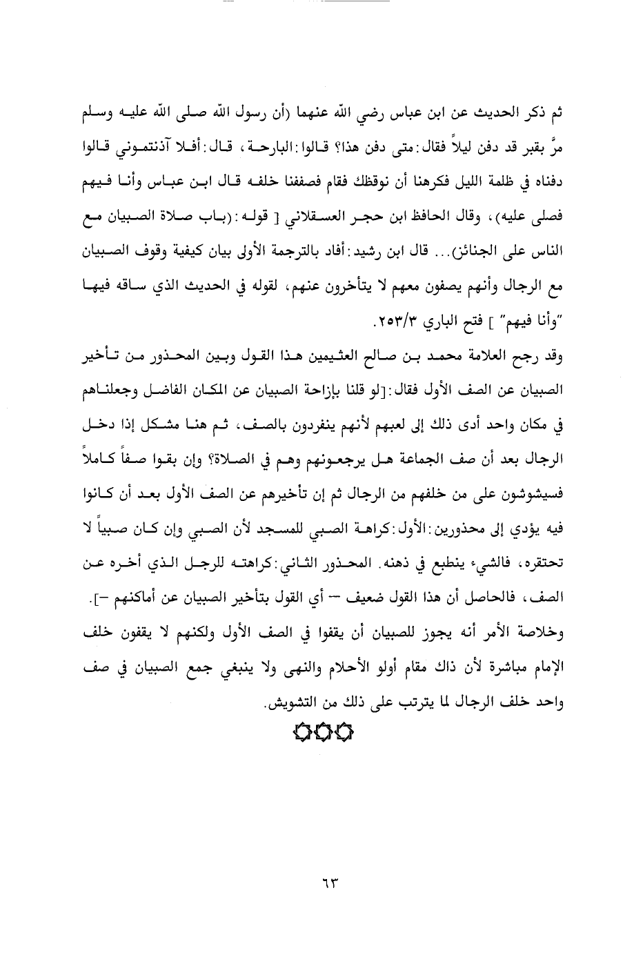 ثم ذكر الحديث عن ابن عباس رضي الله عنهما أن رسول الله صلى الله عليه وسلم مرَّ بقبر قد دفن ليلاً فقال: متى دفن هذا؟ قالوا: البارحة، قال: أفلا آذنتموني قالوا دفناه في ظلمة الليل فكرهنا أن نوقظك فقام فصففنا خلفه قال ابن عباس وأنا فيهم فصلى عليه (، وقال الحافظ ابن حجر العسقلاني [قوله: (باب صلاة الصبيان مع الناس على الجنائز) ... قال ابن رشيد: أفاد بالترجمة الأولى بيان كيفية وقوف الصبيان مع الرجال وأنهم يصفون معهم لا يتأخرون عنهم، لقوله في الحديث الذي ساقه فيها " وأنا فيهم "] فتح الباري 3/ 253.