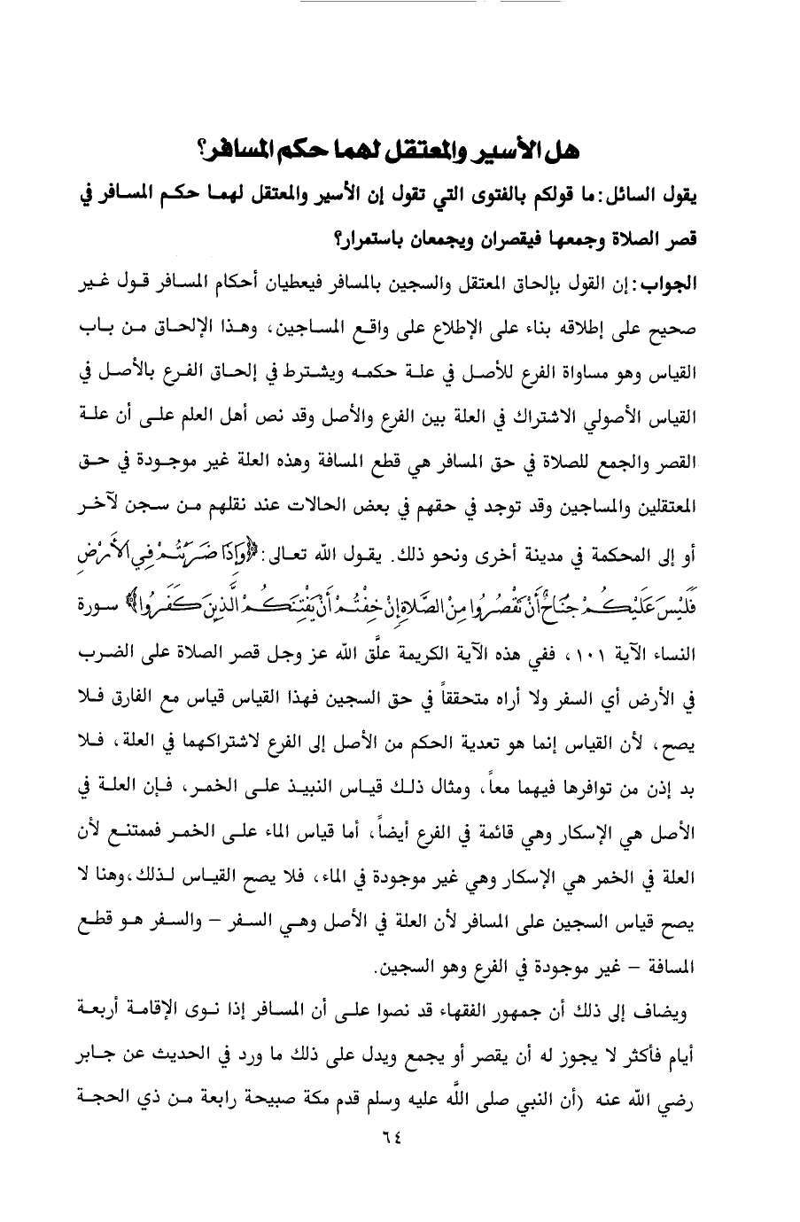 الجواب: إن القول بإلحاق المعتقل والسجين بالمسافر فيعطيان أحكام المسافر قول غير صحيح على إطلاقه بناء على الإطلاع على واقع المساجين، وهذا الإلحاق من باب القياس وهو مساواة الفرع للأصل في علة حكمه ويشترط في إلحاق الفرع بالأصل في القياس الأصولي الاشتراك في العلة بين الفرع والأصل وقد نص أهل العلم على أن علة القصر والجمع للصلاة في حق المسافر هي قطع المسافة وهذه العلة غير موجودة في حق المعتقلين والمساجين وقد توجد في حقهم في بعض الحالات عند نقلهم من سجن لآخر أو إلى المحكمة في مدينة أخرى ونحو ذلك. يقول الله تعالى: {وَإِذَا ضَرَبْتُمْ فِي الأَرْضِ فَلَيْسَ عَلَيْكُمْ جُنَاحٌ أَنْ تَقْصُرُوا مِنْ الصَّلاةِ إِنْ خِفْتُمْ أَنْ يَفْتِنَكُمْ الَّذِينَ كَفَرُوا} سورة النساء الآية 101، ففي هذه الآية الكريمة علَّق الله عز وجل قصر الصلاة على الضرب في الأرض أي السفر ولا أراه متحققاً في حق السجين فهذا القياس قياس مع الفارق فلا يصح، لأن القياس إنما هو تعدية الحكم من الأصل إلى الفرع لاشتراكهما في العلة، فلا بد إذن من توافرها فيهما معاً، ومثال ذلك قياس النبيذ على الخمر، فإن العلة في الأصل هي الإسكار وهي قائمة في الفرع أيضاً، أما قياس الماء على الخمر فممتنع لأن العلة في الخمر هي الإسكار وهي غير موجودة في الماء، فلا يصح القياس لذلك، وهنا لا يصح قياس السجين على المسافر لأن العلة في الأصل وهي السفر - والسفر هو قطع المسافة - غير موجودة في الفرع وهو السجين.