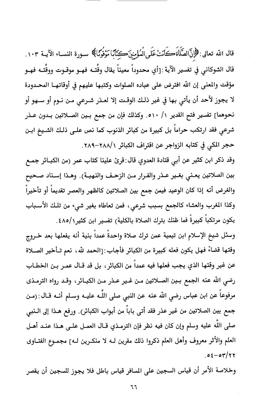 قال الله تعالى: {إِنَّ الصَّلَاةَ كَانَتْ عَلَى الْمُؤْمِنِينَ كِتَابًا مَوْقُوتًا} سورة النساء الآية 103. قال الشوكاني في تفسير الآية: [أي محدوداً معيناً يقال وقَّته فهو موقوت ووقَّته فهو مؤقت والمعنى إن الله افترض على عباده الصلوات وكتبها عليهم في أوقاتها المحدودة لا يجوز لأحد أن يأتي بها في غير ذلك الوقت إلا لعذر شرعي من نوم أو سهو أو نحوهما] تفسير فتح القدير 1/ 510. وكذلك فإن من جمع بين الصلاتين بدون عذر شرعي فقد ارتكب حراماً بل كبيرة من كبائر الذنوب كما نص على ذلك الشيخ ابن حجر المكي في كتابه الزواجر عن اقتراف الكبائر 1/ 288 - 289.