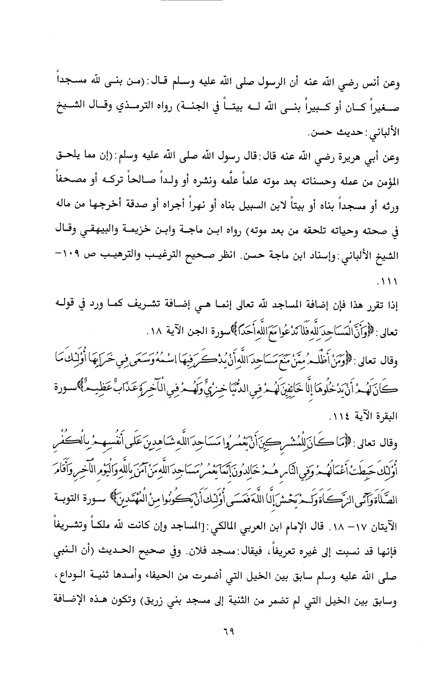 وقال تعالى {ما كان للمشركين أن يعمروا مساجد الله شاهدين على أنفسهم بالكفر أولئك حبطت أعمالهم وفي النار هم خالدون إنما يعمر مساجد الله من آمن بالله واليوم الآخر وأقام الصلاة وآتى الزكاة ولم يخش إلا الله فعسى أولئك أن يكونوا من المهتدين} سورة التوبة الآيتان 17 - 18. قال الإمام ابن العربي المالكي [المساجد وإن كانت لله ملكاً وتشريفاً فإنها قد نسبت إلى غيره تعريفاً، فيقال: مسجد فلان. وفي صحيح الحديث (أن النبي صلى الله عليه وسلم سابق بين الخيل التي أضمرت من الحيفاء وأمدها ثنية الوداع، وسابق بين الخيل التي لم تضمر من الثنية إلى مسجد بني زريق) وتكون هذه الإضافة