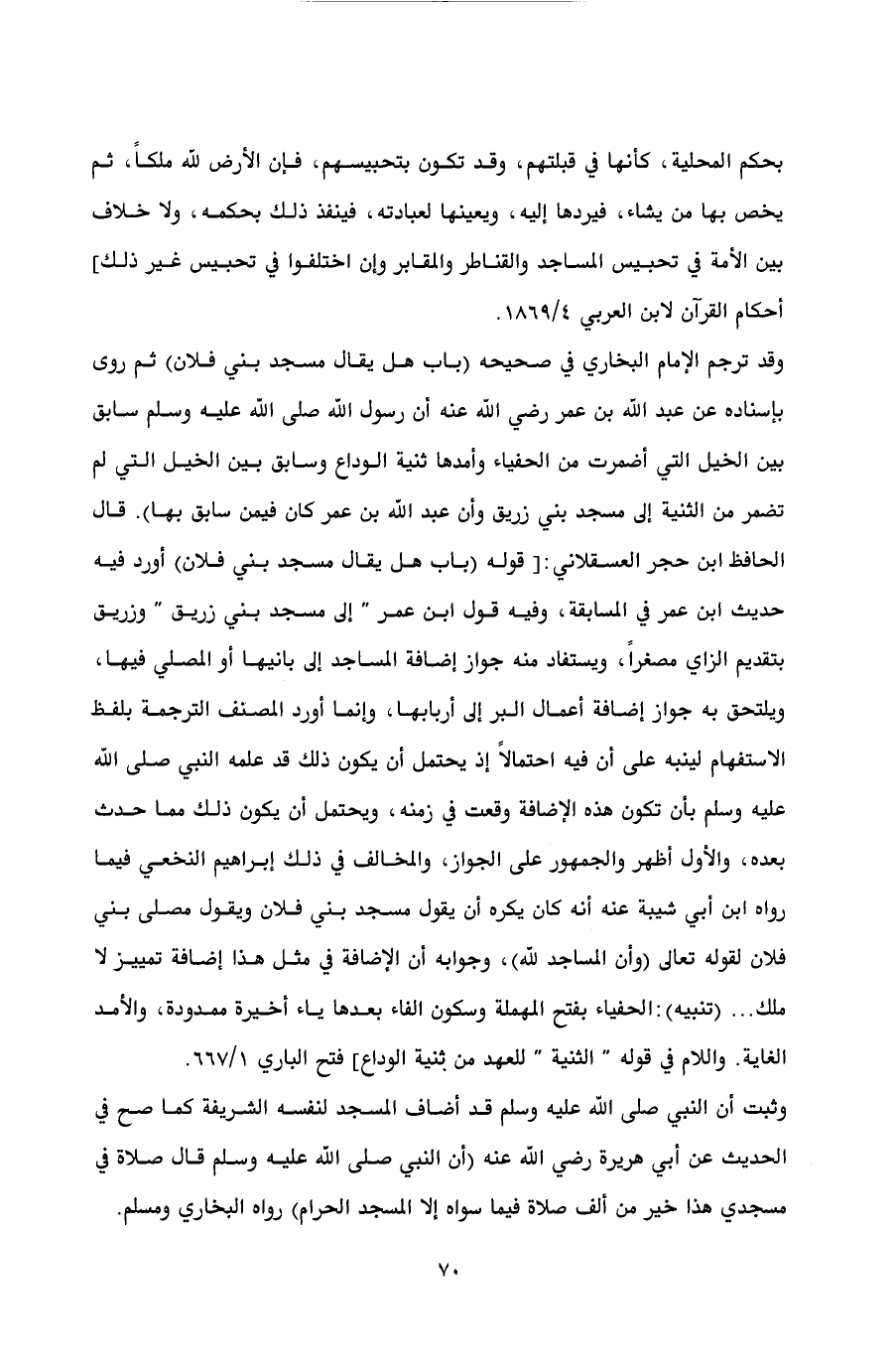 وقد ترجم الإمام البخاري في صحيحه (باب هل يقال مسجد بني فلان) ثم روى بإسناده عن عبد الله بن عمر رضي الله عنه أن رسول الله صلى الله عليه وسلم سابق بين الخيل التي أضمرت من الحفياء وأمدها ثنية الوداع وسابق بين الخيل التي لم تضمر من الثنية إلى مسجد بني زريق وأن عبد الله بن عمر كان فيمن سابق بها). قال الحافظ ابن حجر العسقلاني [قوله (باب هل يقال مسجد بني فلان) أورد فيه حديث ابن عمر في المسابقة، وفيه قول ابن عمر " إلى مسجد بني زريق " وزريق بتقديم الزاي مصغراً، ويستفاد منه جواز إضافة المساجد إلى بانيها أو المصلي فيها، ويلتحق به جواز إضافة أعمال البر إلى أربابها، وإنما أورد المصنف الترجمة بلفظ الاستفهام لينبه على أن فيه احتمالاً إذ يحتمل أن يكون ذلك قد علمه النبي صلى الله عليه وسلم بأن تكون هذه الإضافة وقعت في زمنه، ويحتمل أن يكون ذلك مما حدث بعده، والأول أظهر والجمهور على الجواز، والمخالف في ذلك إبراهيم النخعي فيما رواه ابن أبي شيبة عنه أنه كان يكره أن يقول مسجد بني فلان ويقول مصلى بني فلان لقوله تعالى (وأن المساجد لله)، وجوابه أن الإضافة في مثل هذا إضافة تمييز لا ملك ... (تنبيه): الحفياء بفتح المهملة وسكون الفاء بعدها ياء أخيرة ممدودة، والأمد الغاية. واللام في قوله " الثنية " للعهد من ثنية الوداع.] فتح الباري 1/ 667.