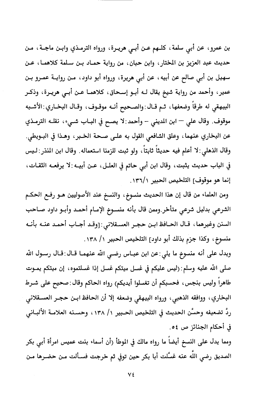ومما يدل على النسخ أيضاً ما رواه مالك في الموطأ (أن أسماء بنت عميس امرأة أبي بكر الصديق رضي اللَّه عنه غسَّلت أبا بكر حين توفي ثم خرجت فسألت من حضرها من
