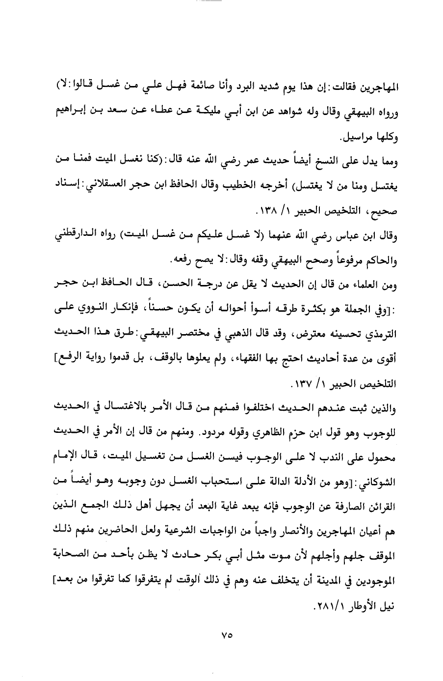 ومما يدل على النسخ أيضاً حديث عمر رضي الله عنه قال (كنا نغسل الميت فمنا من يغتسل ومنا من لا يغتسل) أخرجه الخطيب وقال الحافظ ابن حجر العسقلاني: إسناد صحيح، التلخيص الحبير 1/ 138.