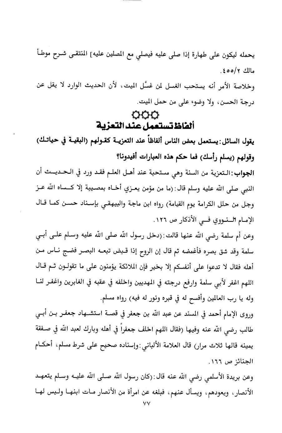 الجواب: التعزية من السنة وهي مستحبة عند أهل العلم فقد ورد في الحديث أن النبي صلى الله عليه وسلم قال: (ما من مؤمن يعزي أخاه بمصيبة إلا كساه الله عز وجل من حلل الكرامة يوم القيامة) رواه ابن ماجة والبيهقي بإسناد حسن كما قال الإمام النووي في الأذكار ص 126.