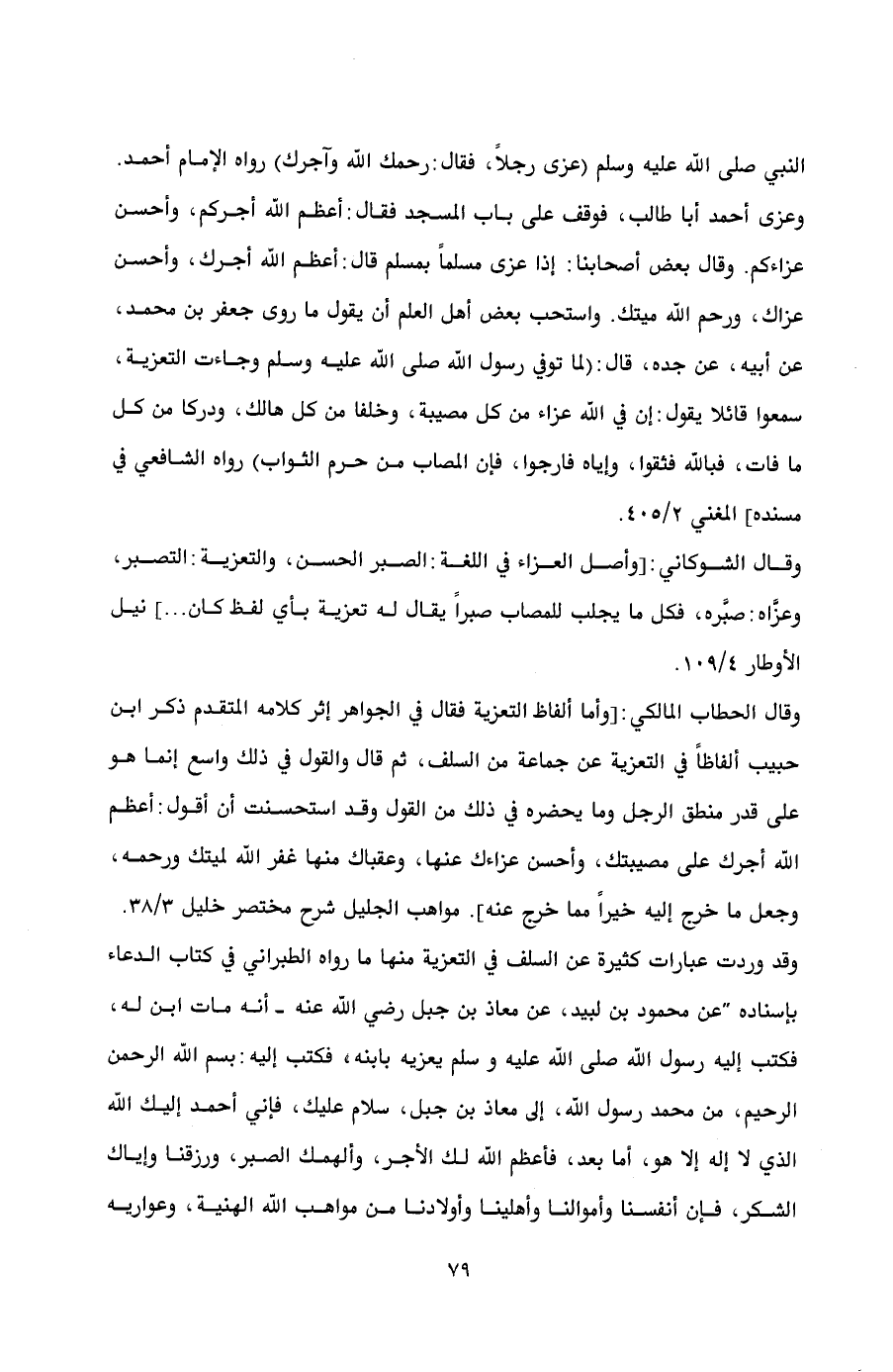وقال الشوكاني: [وأصل العزاء في اللغة: الصبر الحسن، والتعزية: التصبر، وعزَّاه: صبَّره، فكل ما يجلب للمصاب صبراً يقال له تعزية بأي لفظ كان ... ] نيل الأوطار 4/ 109.
