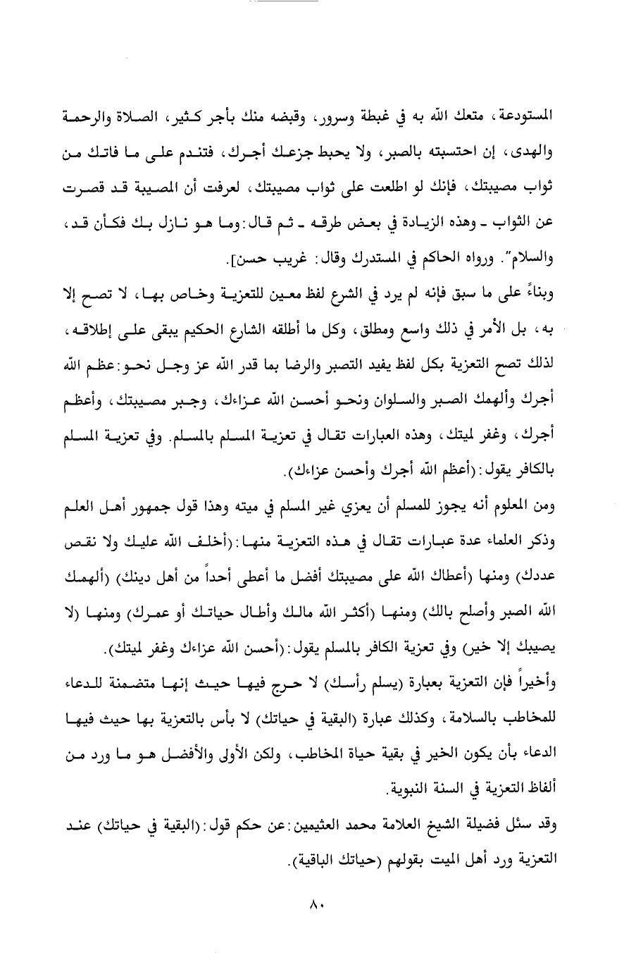المستودعة، متعك الله به في غبطة وسرور، وقبضه منك بأجر كثير، الصلاة والرحمة والهدى، إن احتسبته بالصبر، ولا يحبط جزعك أجرك، فتندم على مافاتك من ثواب مصيبتك، فإنك لو اطلعت على ثواب مصيبتك، لعرفت أن المصيبة قد قصرت عن الثواب ـ وهذه الزيادة في بعض طرقه ـ ثم قال: وما هو نازل بك فكأن قد، والسلام ". ورواه الحاكم في المستدرك وقال: غريب حسن].