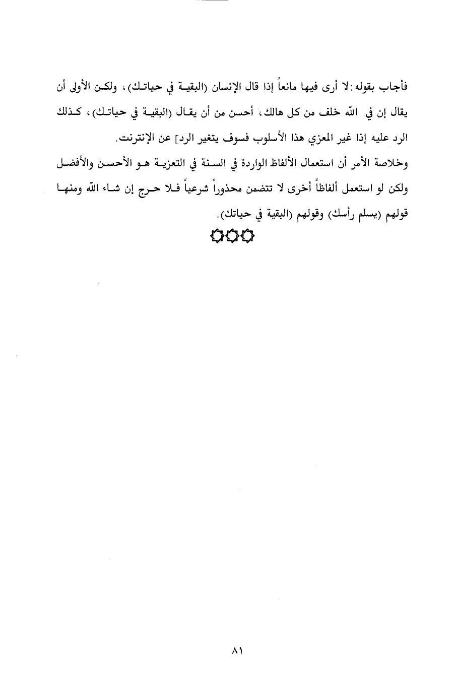 فأجاب بقوله: لا أرى فيها مانعاً إذا قال الإنسان (البقية في حياتك) لا أرى فيها مانعاً، ولكن الأولى أن يقال إن في الله خلف من كل هالك، أحسن من أن يقال (البقية في حياتك)، كذلك الرد عليه إذا غير المعزي هذا الأسلوب فسوف يتغير الرد.] عن الإنترنت