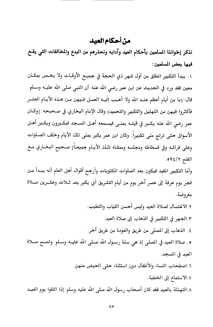 بمناسبة حلول عيد الأضحى المبارك نذكر إخواننا المسلمين بأحكام العيد وآدابه ونحذرهم من البدع والمخالفات التي يقع فيها بعض المسلمين: