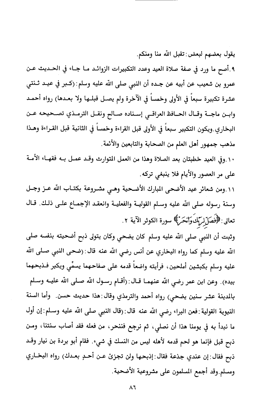 11. ومن شعائر عيد الأضحى المبارك الأضحية وهي مشروعة بكتاب الله عز وجل وسنة رسوله صلى الله عليه وسلم القولية والفعلية وانعقد الإجماع على ذلك. قال تعالى: {فَصَلِّ لِرَبِّكَ وَانْحَرْ} سورة الكوثر الآية 2.
