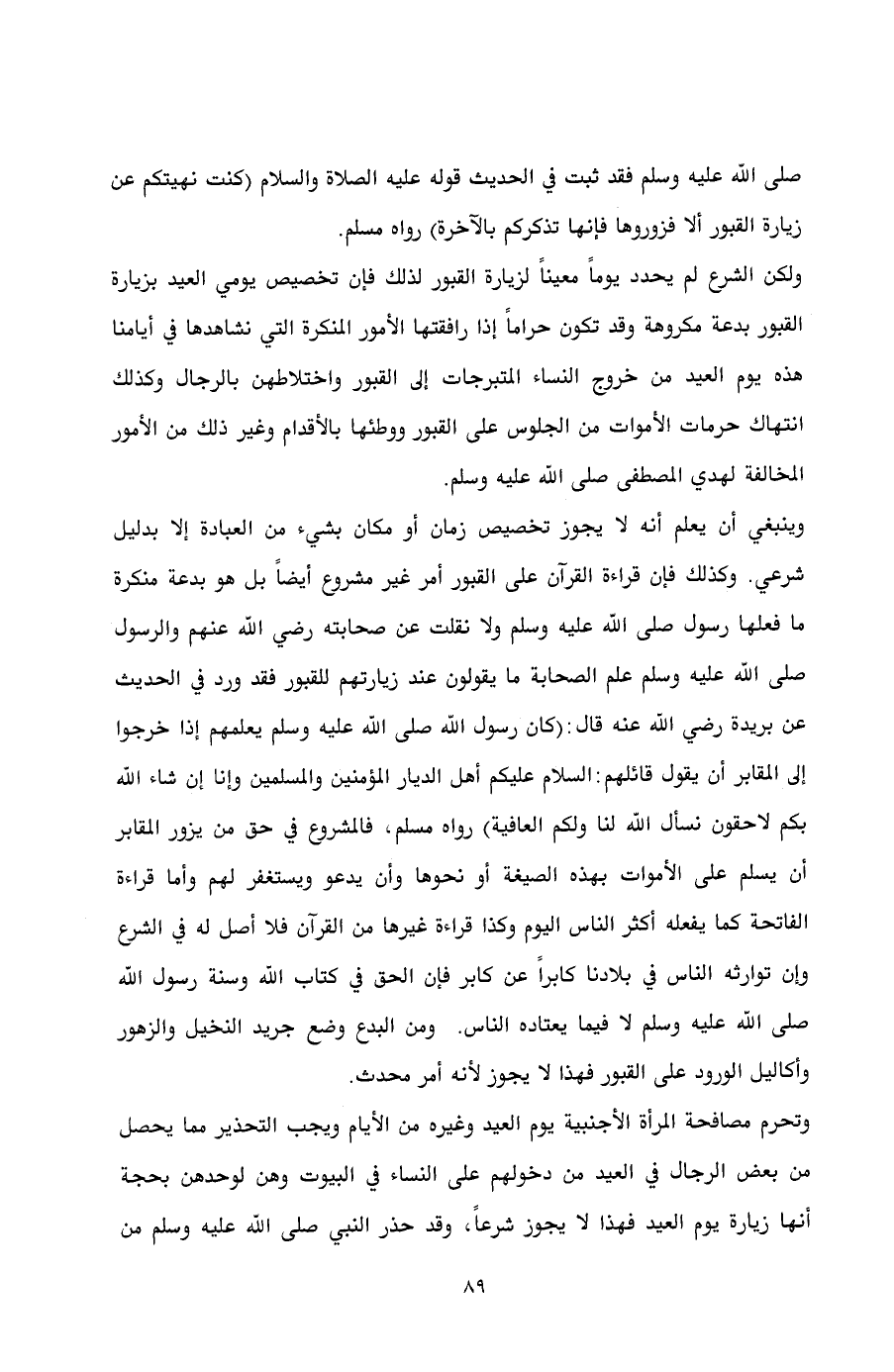ولكن الشرع لم يحدد يوماً معيناً لزيارة القبور لذلك فإن تخصيص يومي العيد بزيارة القبور بدعة مكروهة وقد تكون حراماً إذا رافقتها الأمور المنكرة التي نشاهدها في أيامنا هذه يوم العيد من خروج النساء المتبرجات إلى القبور واختلاطهن بالرجال وكذلك انتهاك حرمات الأموات من الجلوس على القبور ووطئها بالأقدام وغير ذلك من الأمور المخالفة لهدي المصطفى صلى الله عليه وسلم.