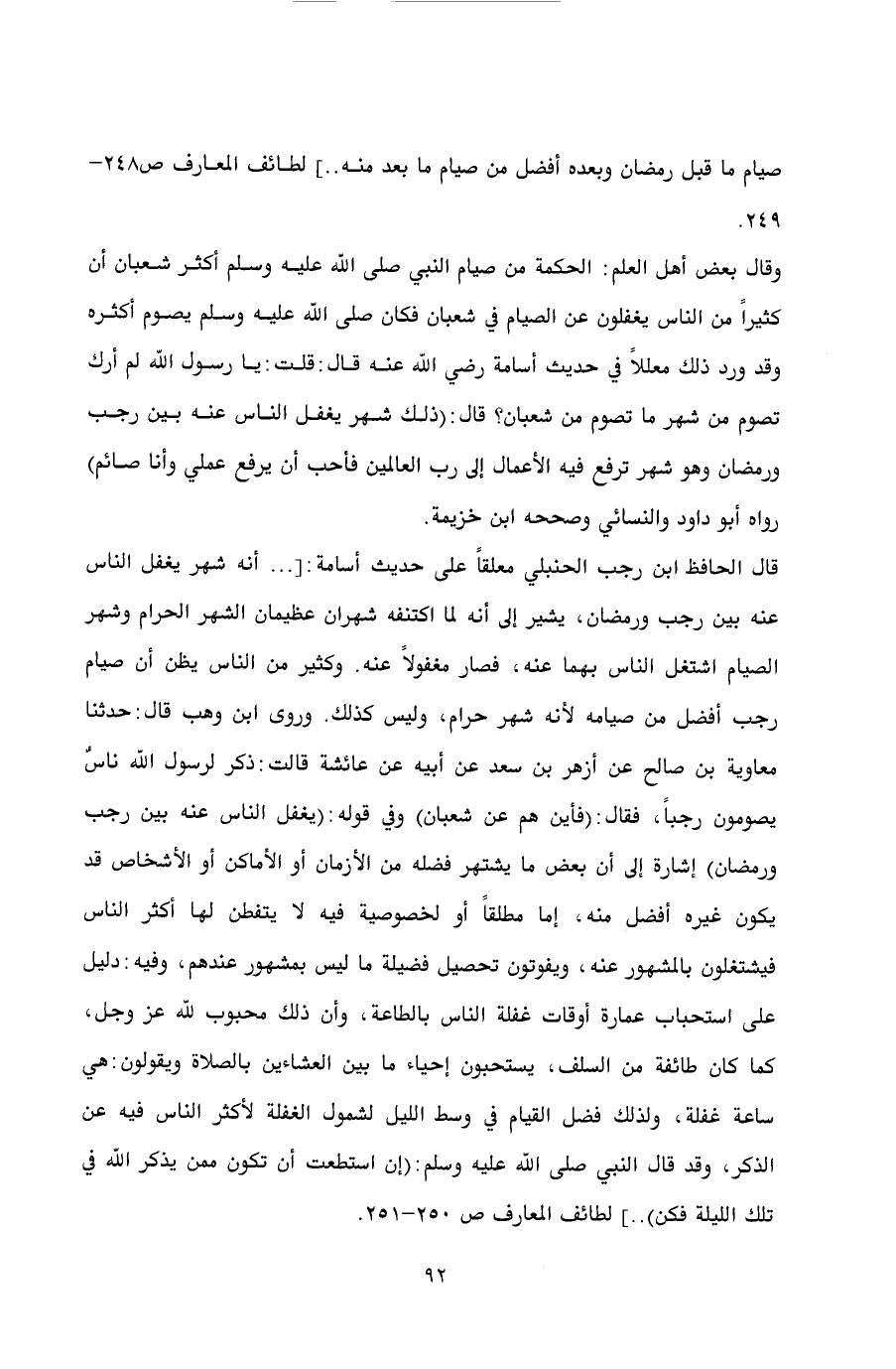 قال الحافظ ابن رجب الحنبلي معلقاً على حديث أسامة: [ ... أنه شهر يغفل الناس عنه بين رجب ورمضان، يشير إلى أنه لما اكتنفه شهران عظيمان الشهر الحرام وشهر الصيام اشتغل الناس بهما عنه، فصار مغفولاً عنه. وكثير من الناس يظن أن صيام رجب أفضل من صيامه لأنه شهر حرام، وليس كذلك. وروى ابن وهب قال: حدثنا معاوية بن صالح عن أزهر بن سعد عن أبيه عن عائشة قالت: ذكر لرسول الله ناسٌ يصومون رجباً، فقال: (فأين هم عن شعبان) وفي قوله: (يغفل الناس عنه بين رجب ورمضان) إشارة إلى أن بعض ما يشتهر فضله من الأزمان أو الأماكن أو الأشخاص قد يكون غيره أفضل منه، إما مطلقاً أو لخصوصية فيه لا يتفطن لها أكثر الناس فيشتغلون بالمشهور عنه، ويفوتون تحصيل فضيلة ما ليس بمشهور عندهم، وفيه: دليل على استحباب عمارة أوقات غفلة الناس بالطاعة، وأن ذلك محبوب لله عز وجل، كما كان طائفة من السلف، يستحبون إحياء ما بين العشاءين بالصلاة ويقولون: هي ساعة غفلة، ولذلك فضل القيام في وسط الليل لشمول الغفلة لأكثر الناس فيه عن الذكر، وقد قال النبي صلى الله عليه وسلم: (إن استطعت أن تكون ممن يذكر الله في تلك الليلة فكن) ... ] لطائف المعارف ص 250 - 251.