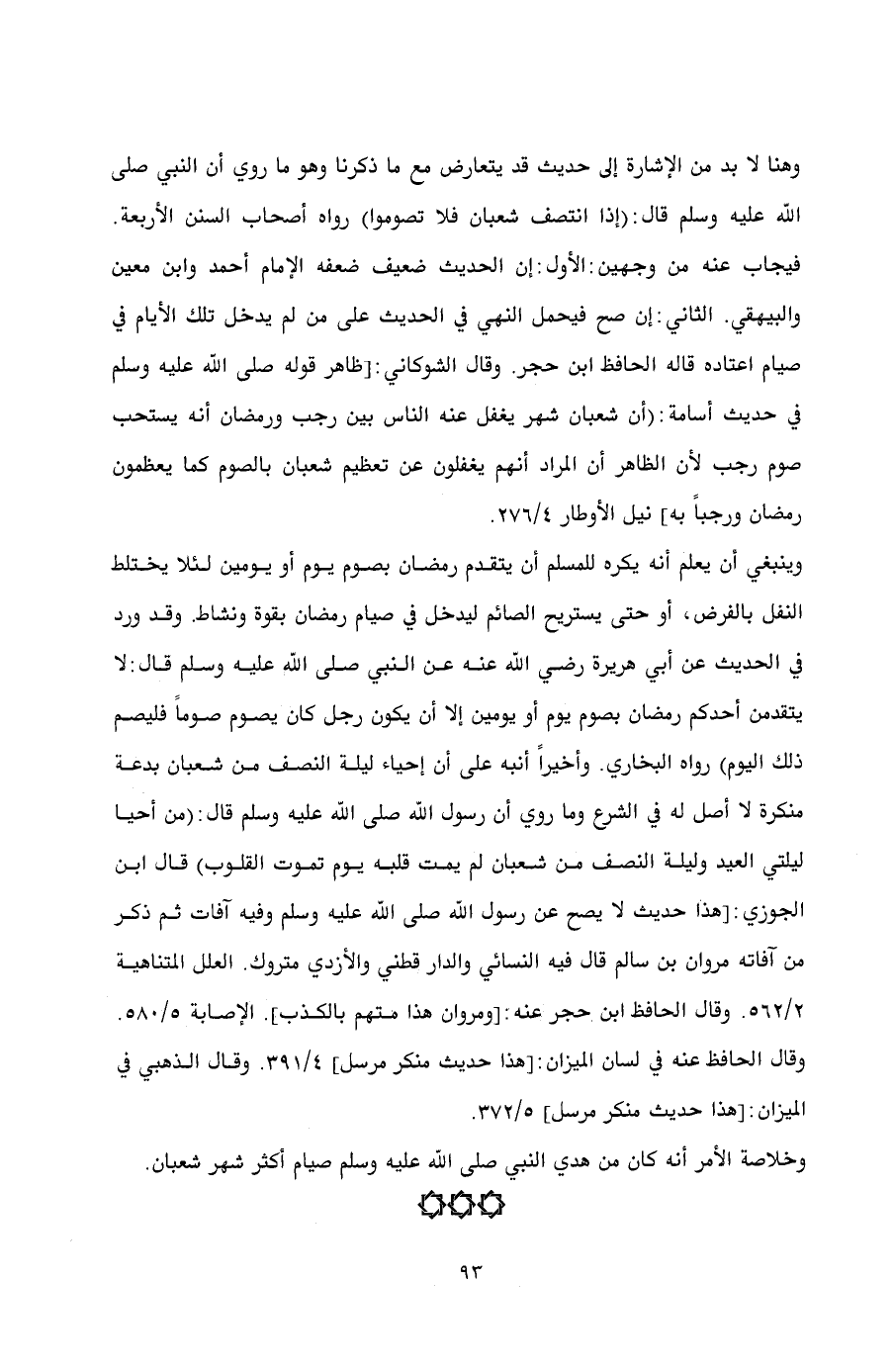 وهنا لا بد من الإشارة إلى حديث قد يتعارض مع ما ذكرنا وهو ما روي أن النبي صلى الله عليه وسلم قال: (إذا انتصف شعبان فلا تصوموا) رواه أصحاب السنن الأربعة. فيجاب عنه من وجهين: الأول: إن الحديث ضعيف ضعفه الإمام أحمد وابن معين والبيهقي. الثاني: إن صح فيحمل النهي في الحديث على من لم يدخل تلك الأيام في صيام اعتاده قاله الحافظ ابن حجر. وقال الشوكاني: ظاهر قوله صلى الله عليه وسلم في حديث أسامة: (أن شعبان شهر يغفل عنه الناس بين رجب ورمضان أنه يستحب صوم رجب لأن الظاهر أن المراد أنهم يغفلون عن تعظيم شعبان بالصوم كما يعظمون رمضان ورجباً به) نيل الأوطار 4/ 276.