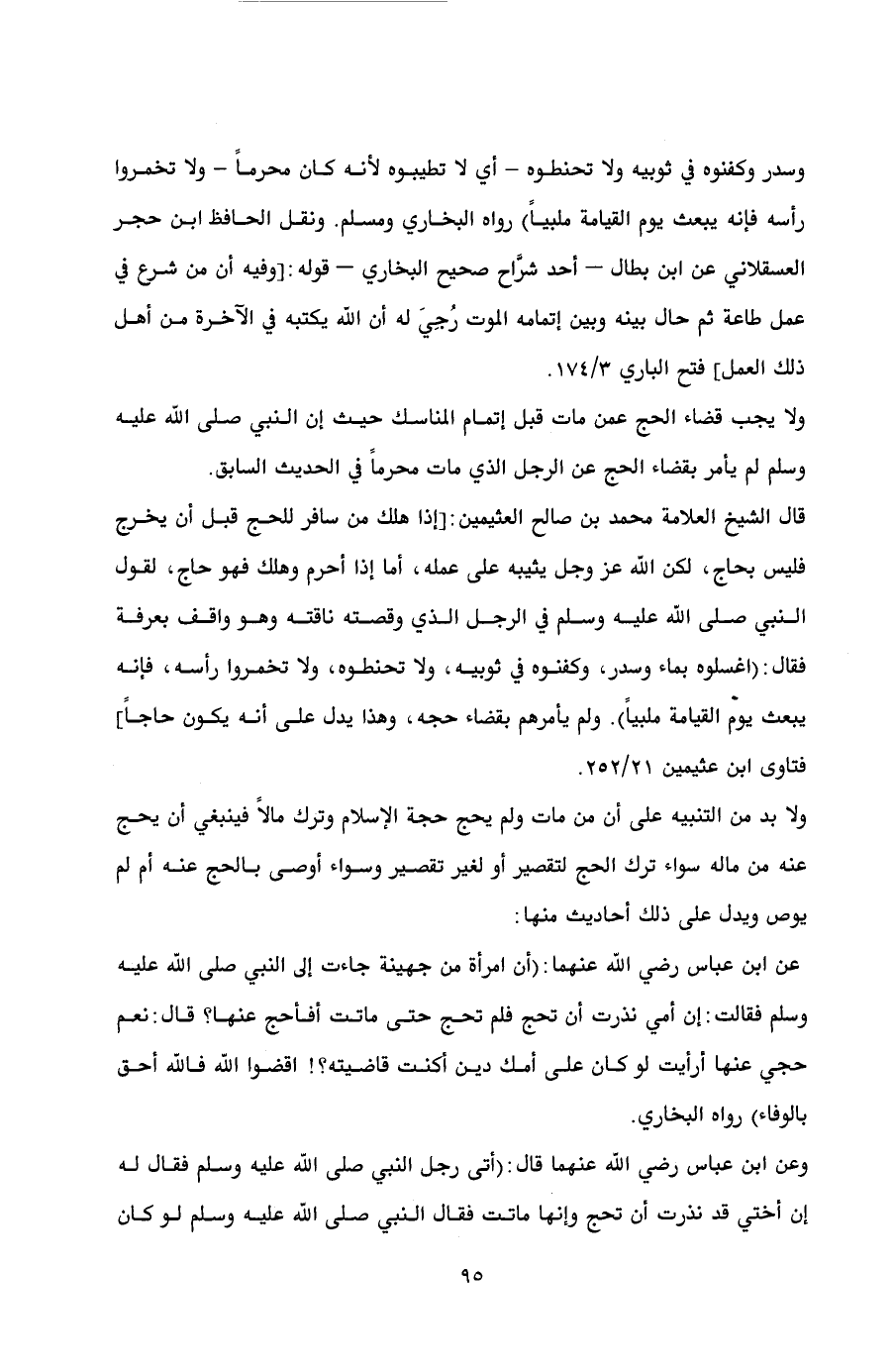 وكفنوه في ثوبيه ولا تحنطوه - أي لا تطيبوه لأنه كان محرماً - ولا تخمروا رأسه فإنه يبعث يوم القيامة ملبياً) رواه البخاري ومسلم. ونقل الحافظ ابن حجر العسقلاني عن ابن بطال - أحد شرَّاح صحيح البخاري - قوله: [وفيه أن من شرع في عمل طاعة ثم حال بينه وبين إتمامه الموت رُجِيَ له أن الله يكتبه في الآخرة من أهل ذلك العمل] فتح الباري 3/ 174.