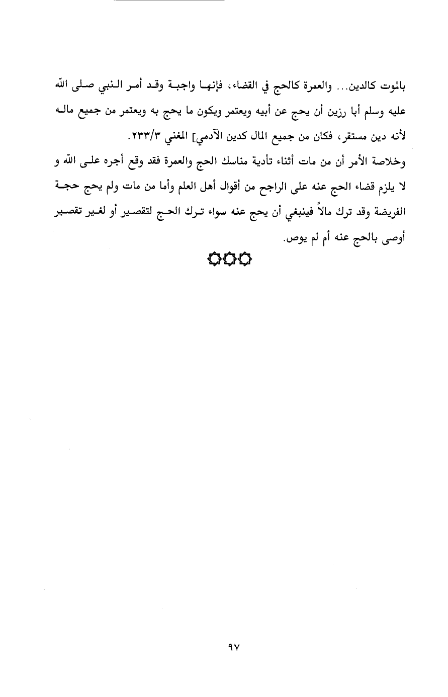 بالموت كالدين ... والعمرة كالحج في القضاء، فإنها واجبة وقد أمر النبي صلى الله عليه وسلم أبا رزين أن يحج عن أبيه ويعتمر ويكون ما يحج به ويعتمر من جميع ماله لأنه دين مستقر، فكان من جميع المال كدين الآدمي.] المغني 3/ 233.