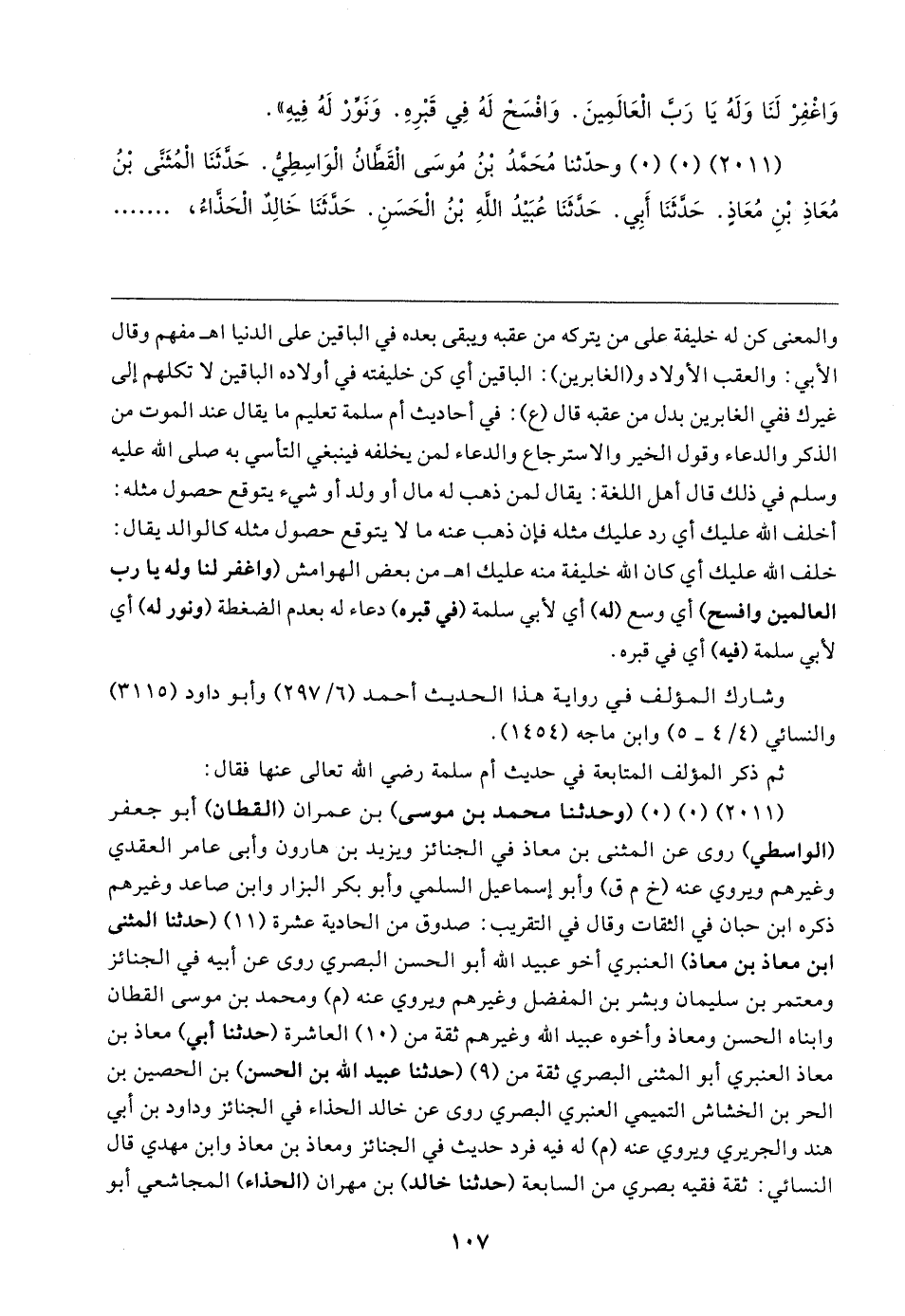 (٢٠١١) (٠) (٠) وحدثنا محمَّد بن موسى) بن عمران (القطان) أبو جعفر (الواسطي) روى عن المثنى بن معاذ في الجنائز ويزيد بن هارون وأبي عامر العقدي وغيرهم ويروي عنه (خ م ق) وأبو إسماعيل السلمي وأبو بكر البزار وابن صاعد وغيرهم ذكره ابن حبان في الثقات وقال في التقريب: صدوق من الحادية عشرة (١١) (حدثنا المثنى بن معاذ بن معاذ) العنبري أخو عبيد الله أبو الحسن البصري روى عن أبيه في الجنائز ومعتمر بن سليمان وبشر بن المفضل وغيرهم ويروي عنه (م) ومحمد بن موسى القطان وابناه الحسن ومعاذ وأخوه عبيد الله وغيرهم ثقة من (١٠) العاشرة (حدثنا أبي) معاذ بن معاذ العنبري أبو المثنى البصري ثقة من (٩) (حدثنا عبيد الله بن الحسن) بن الحصين بن الحر بن الخشاش التميمي العنبري البصري روى عن خالد الحذاء في الجنائز وداود بن أبي هند والجريري ويروي عنه (م) له فيه فرد حديث في الجنائز ومعاذ بن معاذ وابن مهدي قال النسائي: ثقة فقيه بصري من السابعة (حدثنا خالد) بن مهران (الحذاء) المجاشعي أبو
