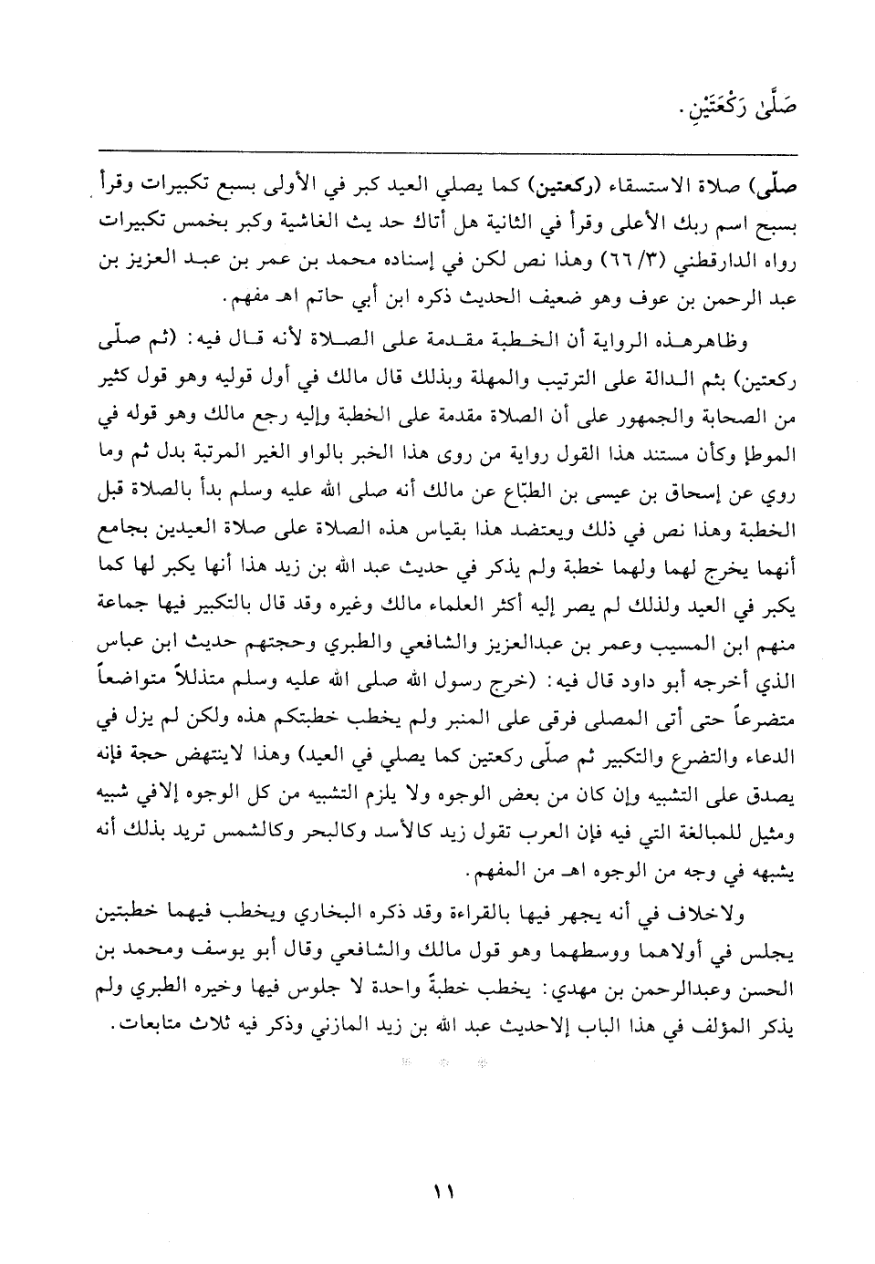 ولا خلاف في أنَّه يجهر فيها بالقراءة وقد ذكره البُخَارِيّ ويخطب فيهما خطبتين يجلس في أولاهما ووسطهما وهو قول مالك والشافعي وقال أبو يوسف ومحمَّد بن الحسن وعبد الرَّحْمَن بن مهدي: يخطب خطبةٌ واحدة لا جلوس فيها وخيره الطبري ولم يذكر المؤلف في هذا الباب إلاحديث عبد الله بن زيد المازنِيّ وذكر فيه ثلاث متابعات.