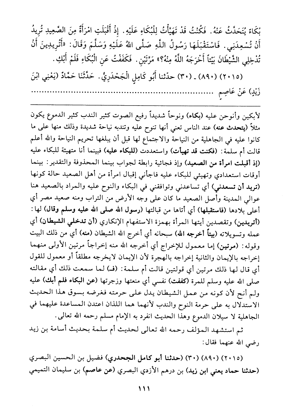 بُكَاءً يُتَحَدَّثُ عَنْهُ. فَكُنْتُ قَدْ تَهَيَّأْتُ لِلْبُكَاءِ عَلَيهِ. إِذْ أَقْبَلَتِ امْرَأَةٌ مِنَ الصَّعِيدِ تُرِيدُ أَنْ تُسْعِدَنِي. فَاسْتَقْبَلَهَا رَسُولُ الله - صلى اللهُ عَلَيهِ وَسلمَ- وَقَال: "أَتُرِيدِينَ أَنْ تُدْخِلِي الشيطَانَ بَيتًا أَخْرَجَهُ الله مِنْهُ؟ " مَرَّتَينِ. فَكَفَفْتُ عَنِ الْبُكَاءِ فَلَمْ أَبْكِ.